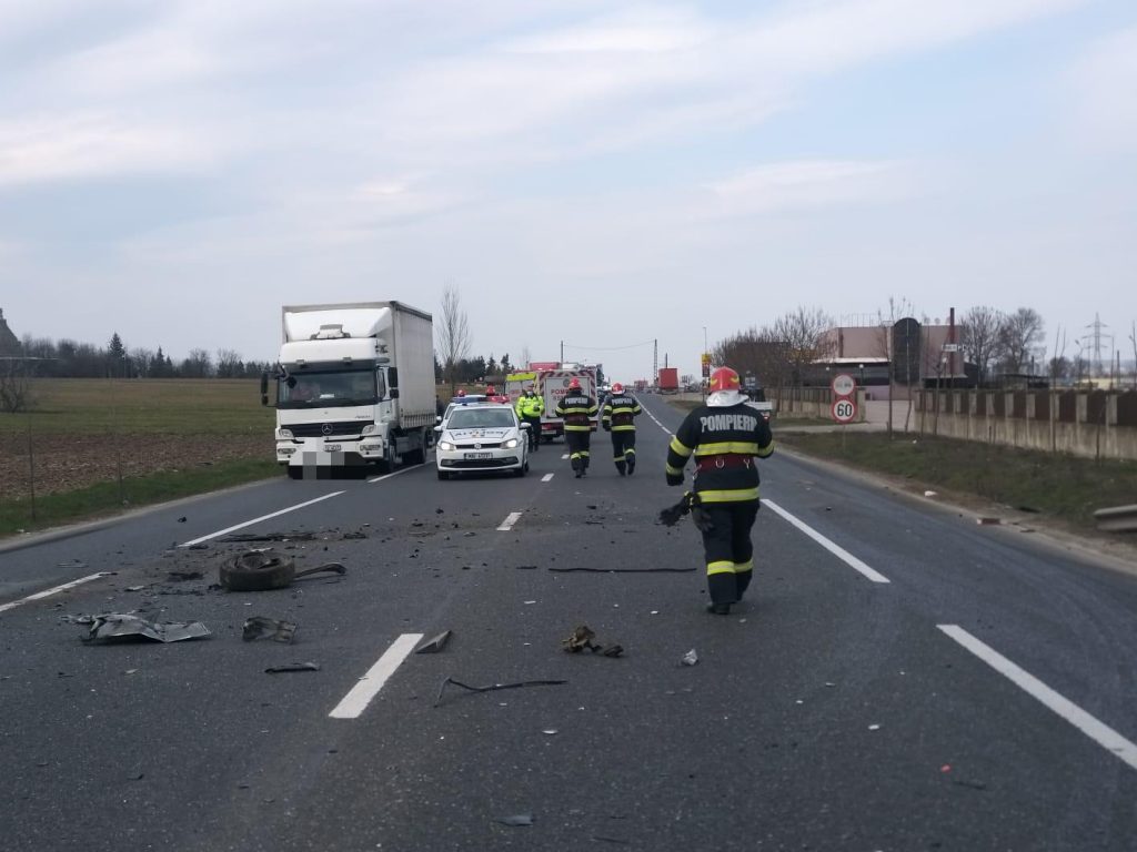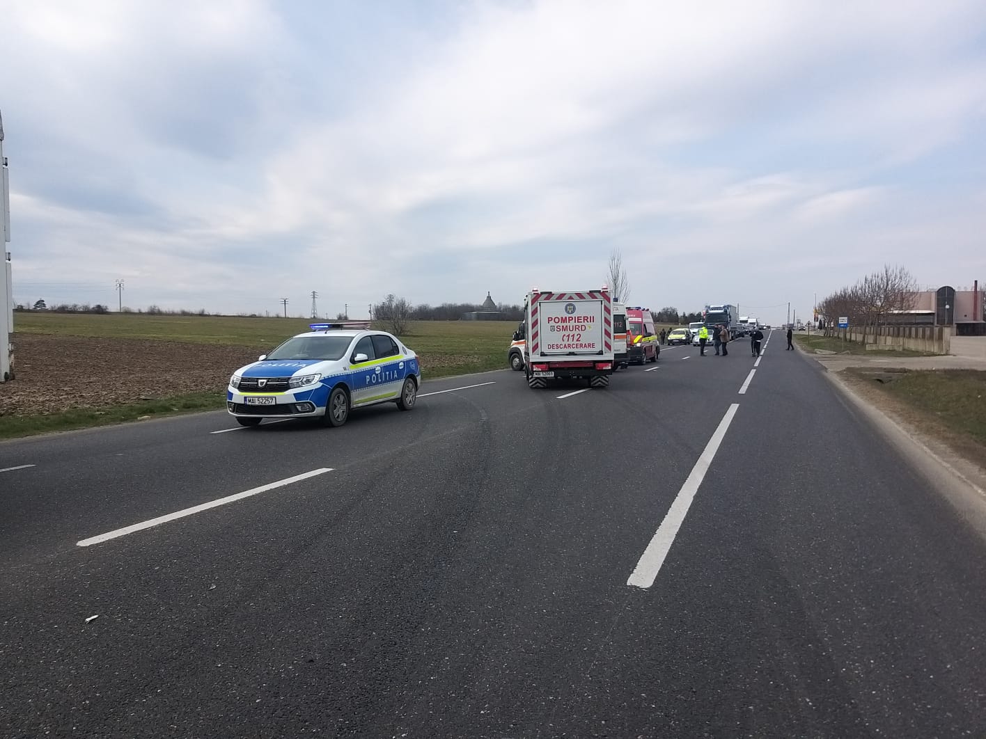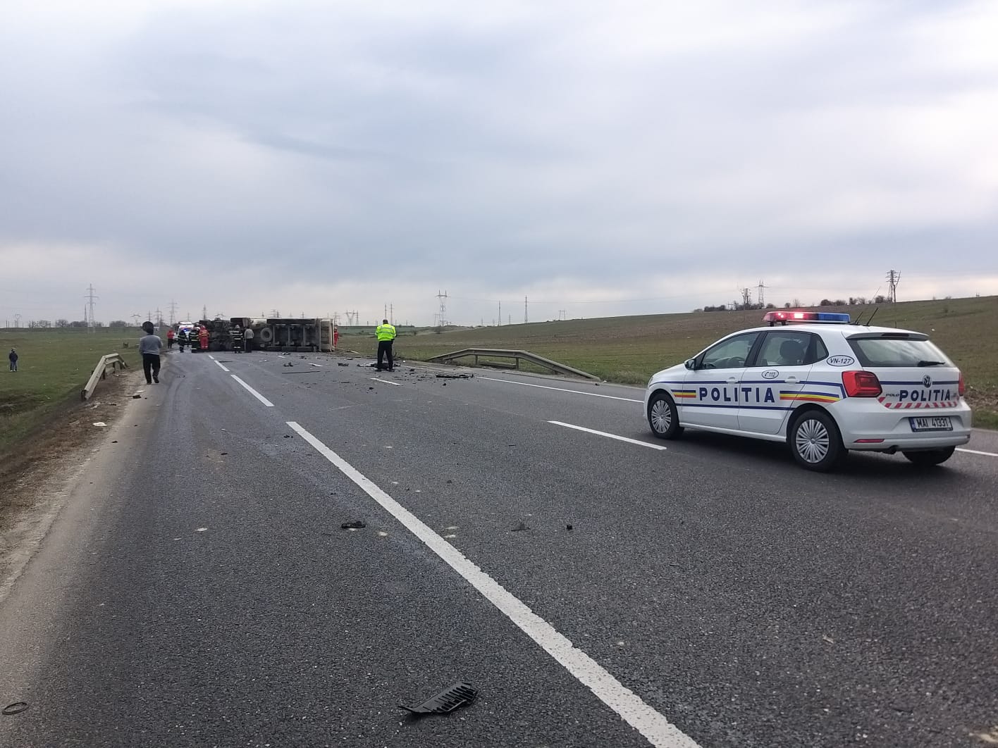 ‘Poliţiştii rutieri au fost sesizaţi prin apel 112 cu privire la faptul ca pe DN2 – E85, la Mărăşeşti, s-a produs un accident rutier. Conform primelor date, un autoturism ar fi intrat în coliziune cu un TIR care transporta pietriş. În urma coliziunii, TIR-ul s-a răsturnat pe partea carosabilă’, a precizat IPJ Vrancea.