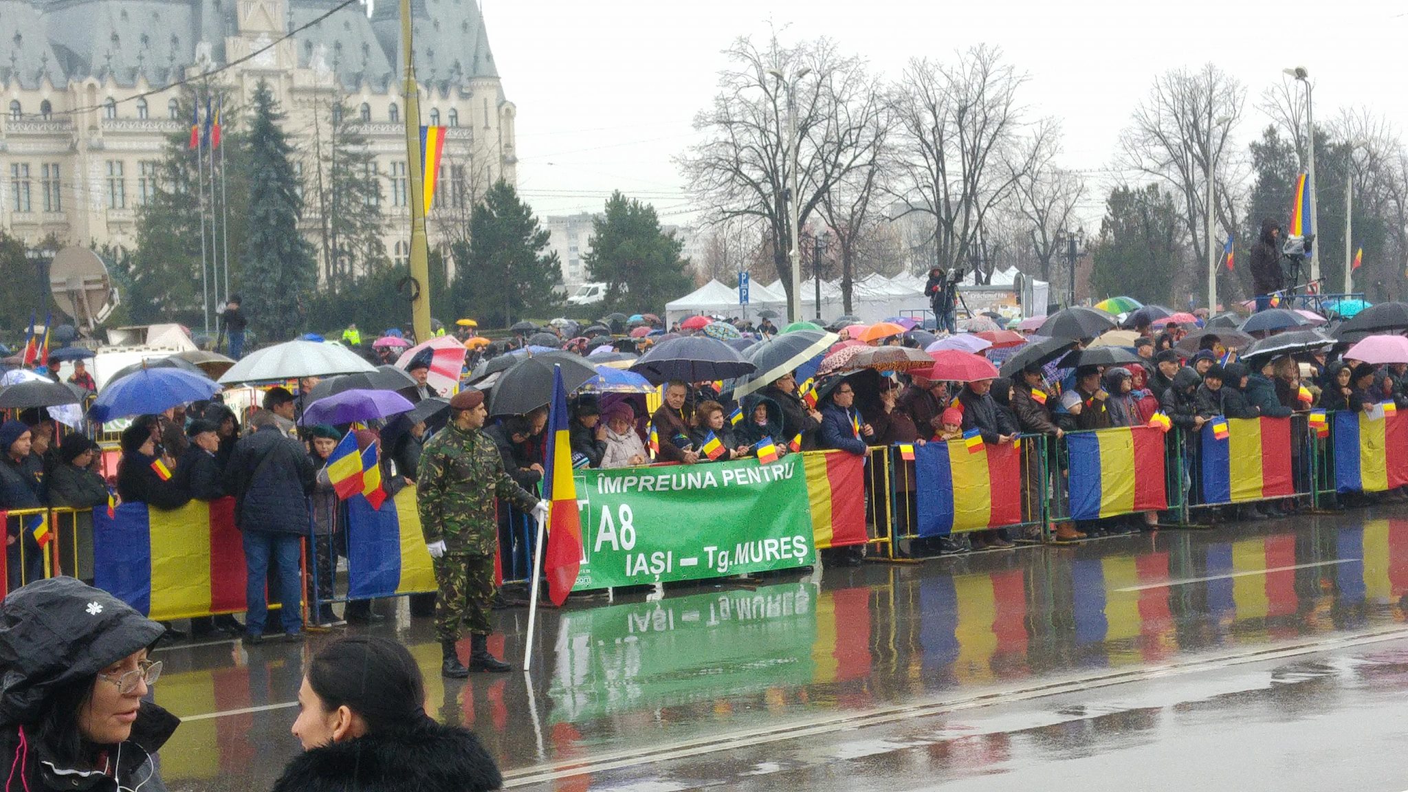 Aproximativ 10.000 de persoane au ignorat ploaia şi au ieşit din case pentru a veni în centrul Iaşului să ia parte la manifestările organizate de municipalitate de Ziua Naţională.