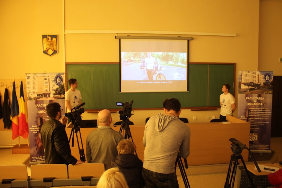 Studenţi din anii terminali de la Facultatea de Mecanică din cadrul Universităţii Tehnice „Gheorghe Asachi” din Iaşi au prezentat, astăzi, prototipul unei maşini în care poate urca un scaun cu rotile.