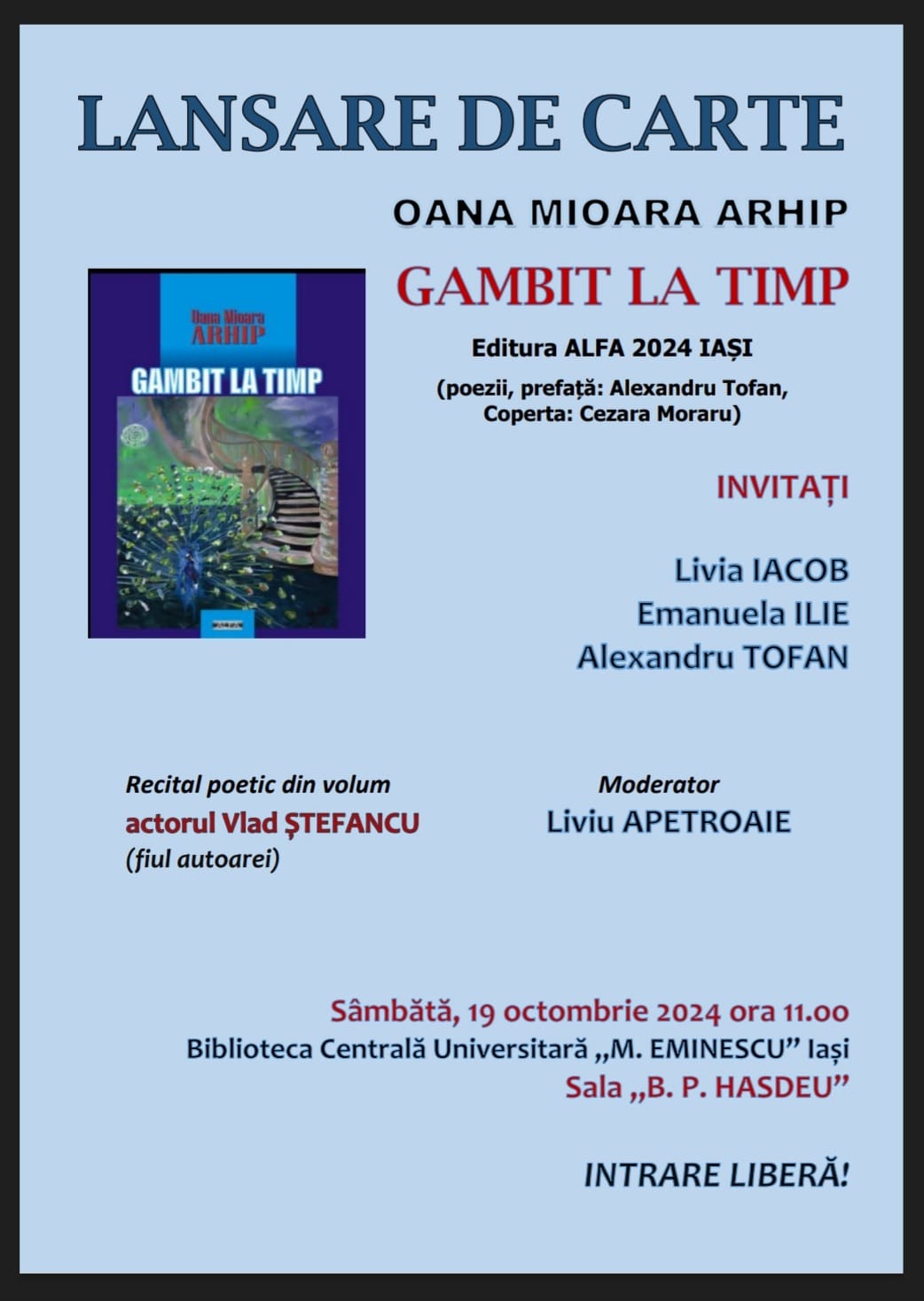 În ziua de sâmbătă, 19 octombrie 2024, începând cu ora 11, va fi lansată cartea Gambit la timp (poezii, prefață: prof. univ. Alexandru Tofan; coperta Cezara Moraru). Volumul este semnat de către poeta Oana Mioara Arhip. Manifestarea se va desfășura în Sala „B. P. Hasdeu” din incinta Bibliotecii Centrale Universitare „Mihai Eminescu” din târgul Iașilor.