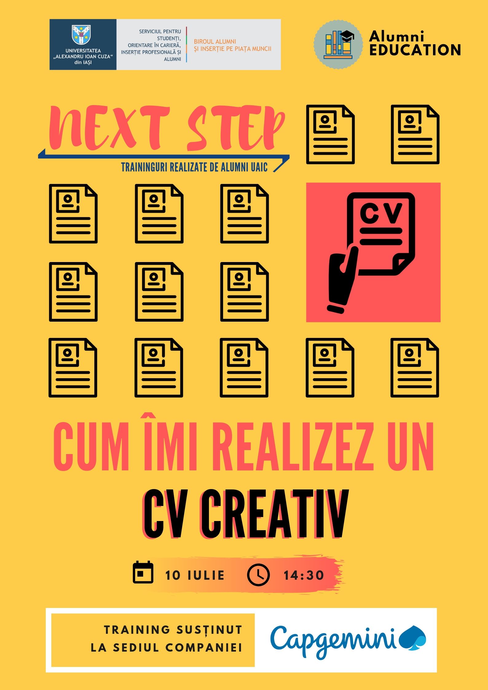 Astfel, miercuri, 10 iulie, de la ora 14:30, studenții vor putea participa la sediul companiei Capgemini la trainingul pe tema „Cum îmi realizez un CV creativ”, realizat de Teodora Todirică – absolventă a programului de Master Strategic Human Resource Management in Europe (FEAA), în prezent Recruiter în cadrul Capgemini și Miruna Cotaie, absolventă a specializării de Licență, Relații internaționale și studii europene (FSSP), în prezent Recruiter & Induction Trainer în cadrul Capgemini. Înscrieri aici: http://www.bit.ly/nextstep-uaic