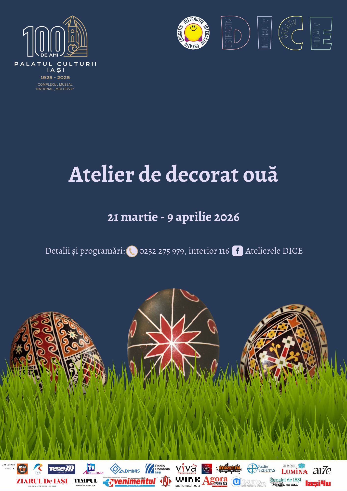 Atelierele de decorat ouă durează aproximativ 90 de minute și se adresează participanților cu vârsta de peste 6 ani (grupuri de min. 5 – max. 24), prețul unui bilet fiind de 25 de lei/ persoană. Programările se pot face la numărul de telefon 0232.275.979, interior 116 sau prin mesaj privat pe pagina Atelierele D.I.C.E.