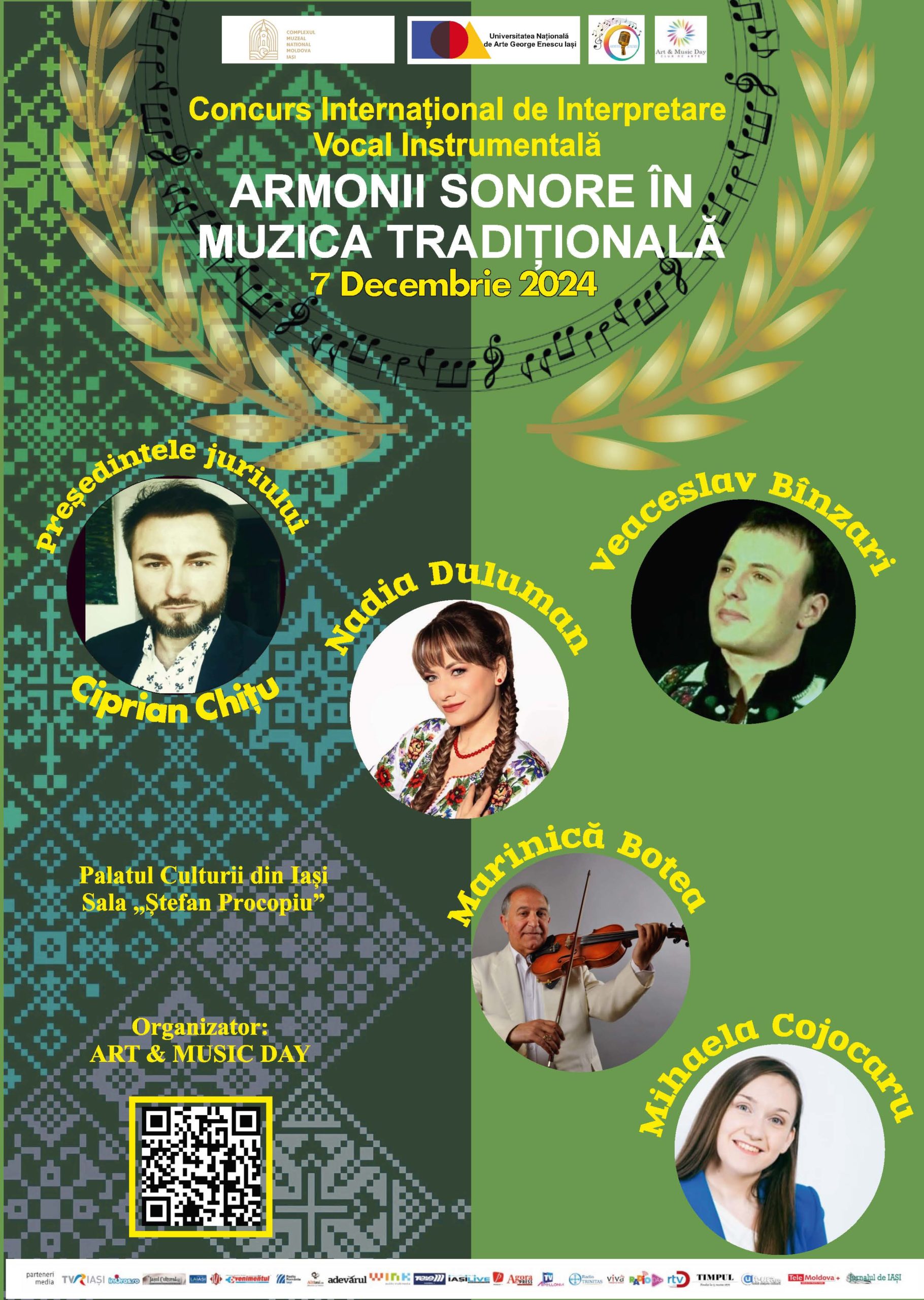 Muzeul Ştiinţei şi Tehnicii „Ştefan Procopiu” din cadrul Complexului Muzeal Naţional „Moldova” laşi, în parteneriat cu Asociaţia Art & Music Day, Universitatea Naţională de Arte „George Enescu” laşi, Colegiul Naţional de Artă „0ctav Băncilă”, vă invită sâmbătă, 7 decembrie 2024, între orele 10.00 – 17.00, la Concursul Internaţional de Interpretare Vocal-lnstrumentală „Armonii Sonore în Muzica Tradiţională”, care va avea loc la Palatul Culturii – Sala „Ştefan Procopiu”.