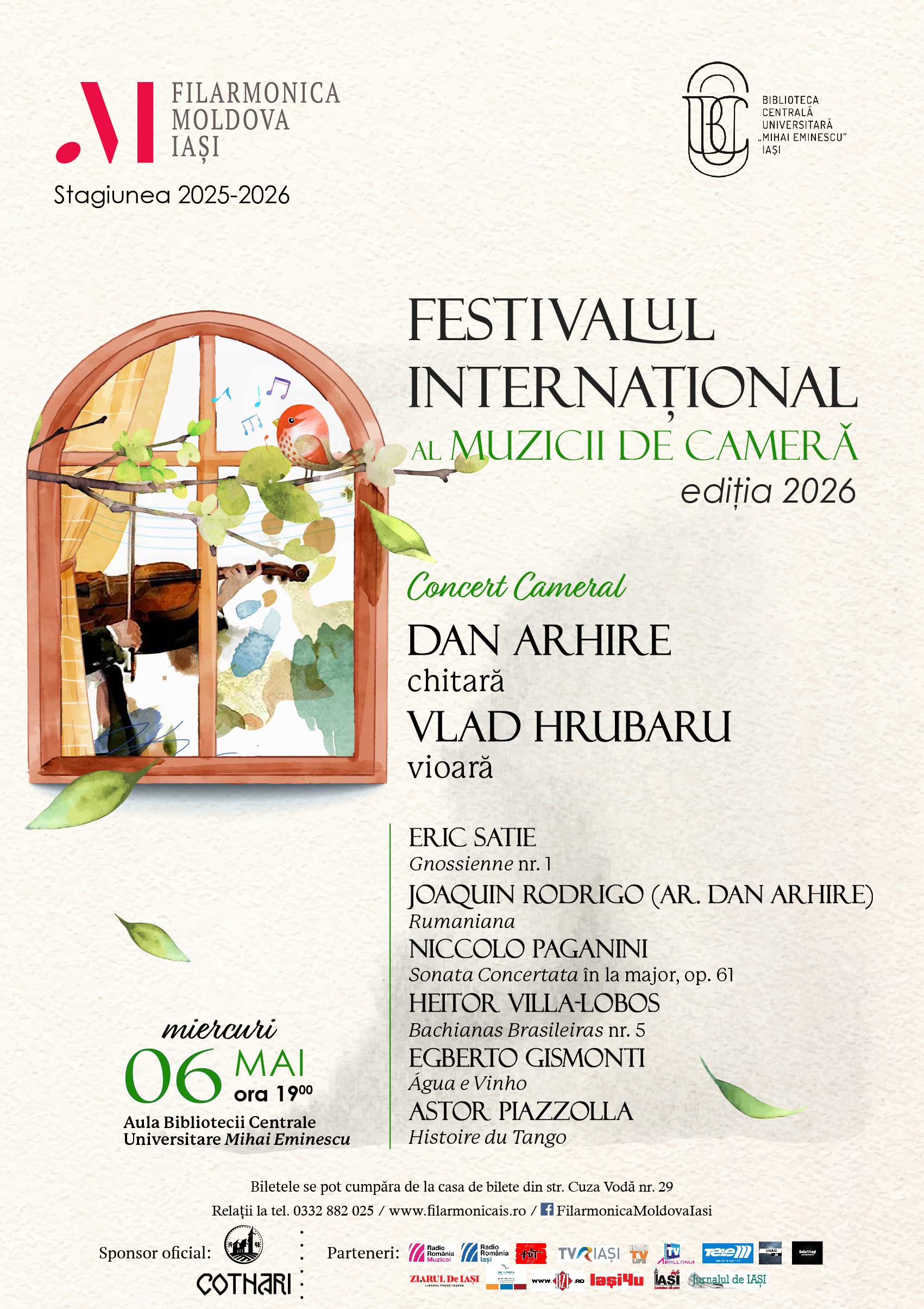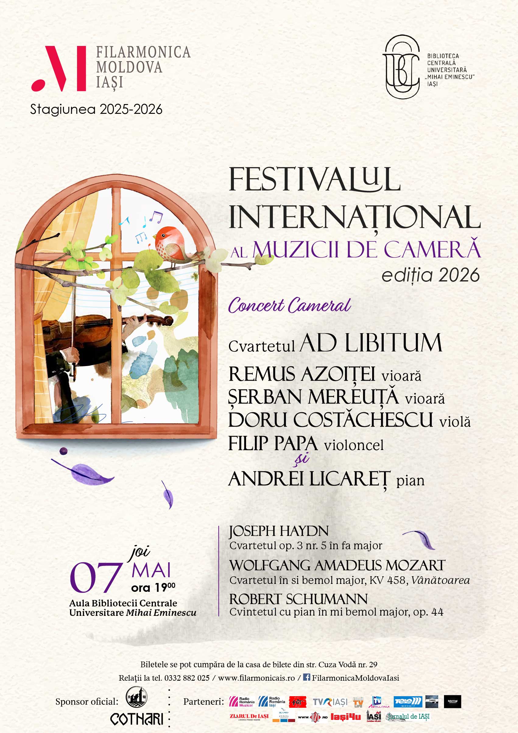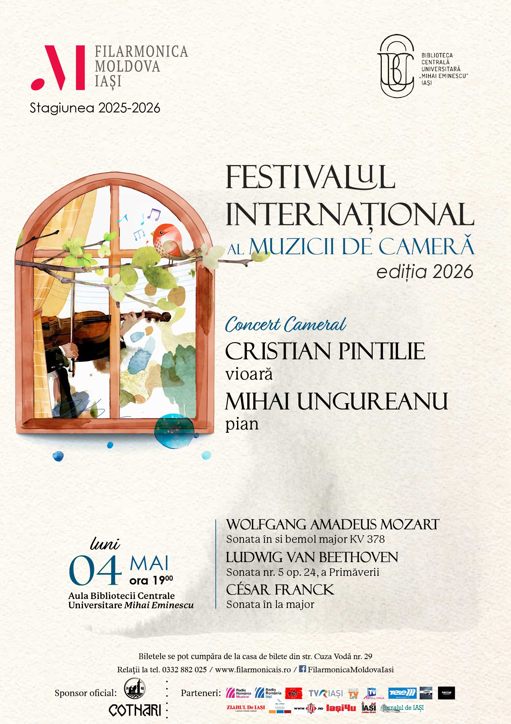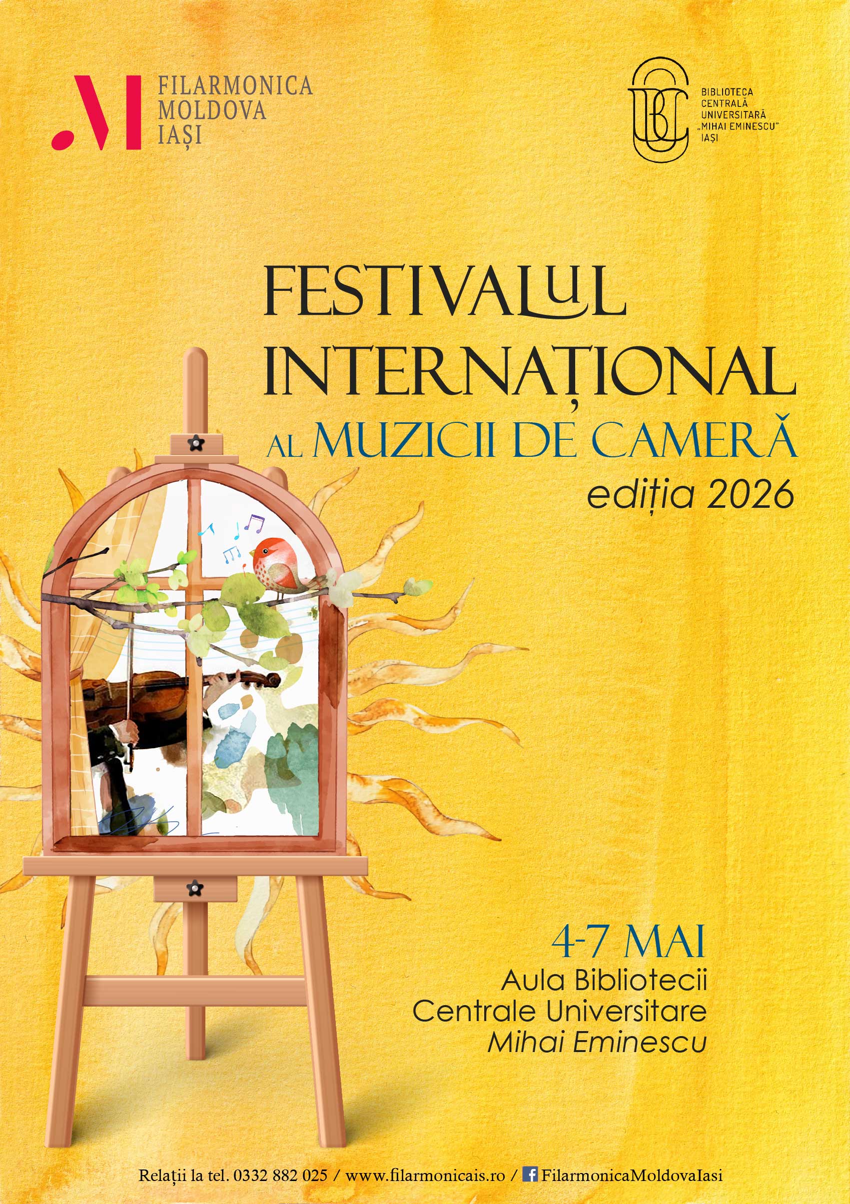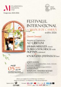 Între 4 și 7 mai 2026, Filarmonica Moldova Iași propune o nouă ediție a Festivalului Internațional al Muzicii de Cameră, desfășurată în Aula Bibliotecii Centrale Universitare Mihai Eminescu. Timp de patru seri, festivalul aduce în prim-plan formule camerale diverse – duo, trio, cvartet și cvintet – și un repertoriu care traversează clasicismul, romantismul și secolul XX.