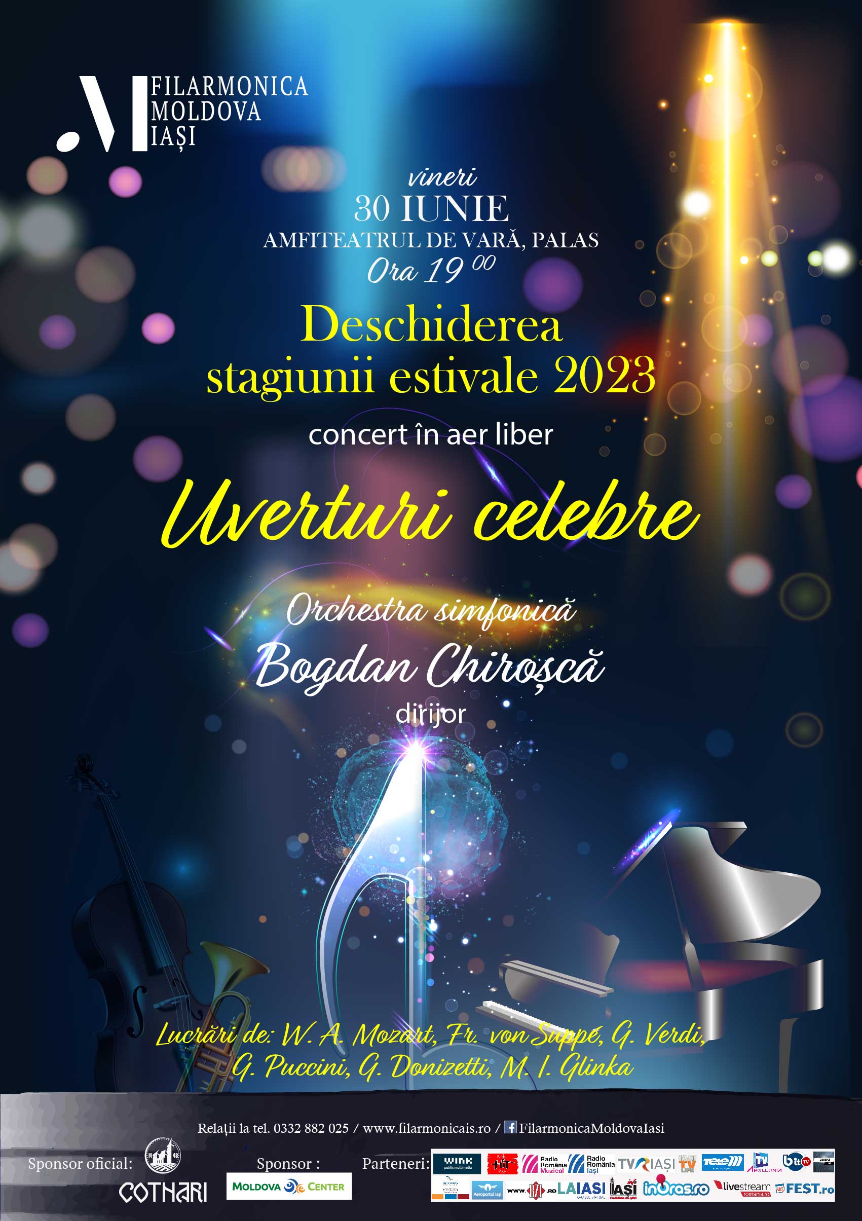 Orchestra simfonică, sub bagheta dirijorului BOGDAN CHIROȘCĂ, vă invită VINERI, 30 iunie 2023, începând cu ora 19:00 la Amfiteatrul Palas – Teatrul de vară, să ascultați lucrări celebre din creația compozitorilor W.A. Mozart, Fr.von Suppé, G. Verdi, G. Donizetti, M.I. Glinka, etc.