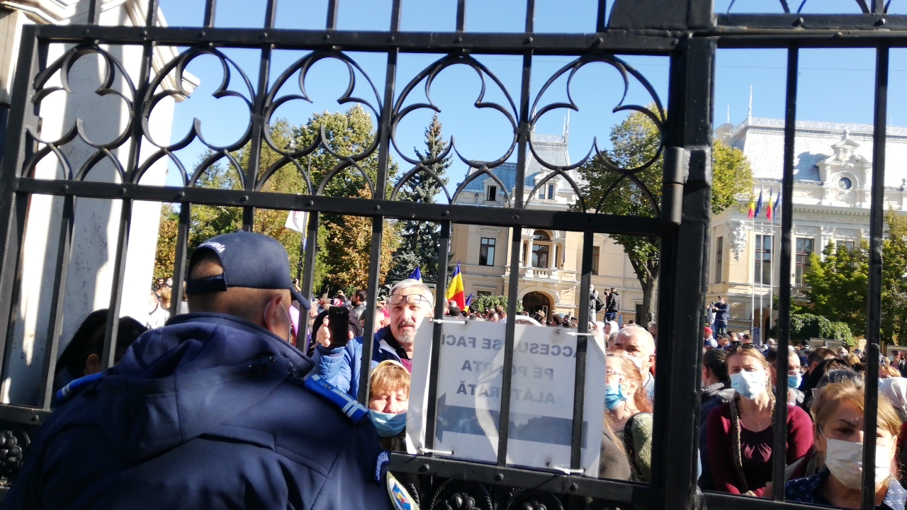 Reprezentanții forțelor de ordine le-au precizat acestora că singura cale de acces în curtea Catedralei Mitropolitane este dinspre Seminarul Ortodox și strada Cantacuzino și doar cu buletinul. (Constantin Mihai, Radio Iași/FOTO Constantin Mihai)
