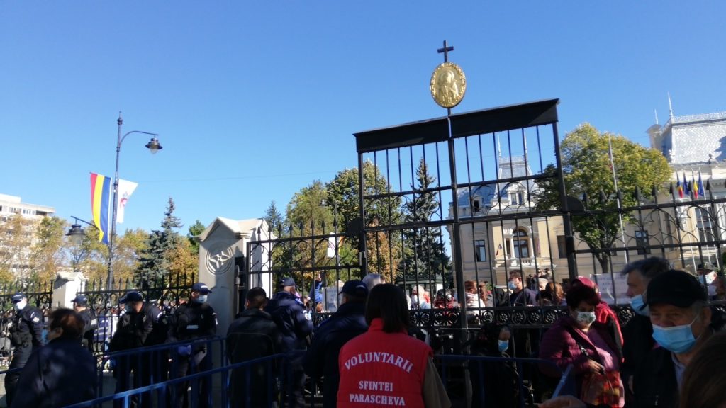 UPDATE, ora 12:49 – Protestele din fața Mitropoliei Iași au continuat, astfel că persoanelor care nu au domiciliul în municipiul Iași le-a fost permis accesul la racla cu moaștele Sfintei Parascheva.