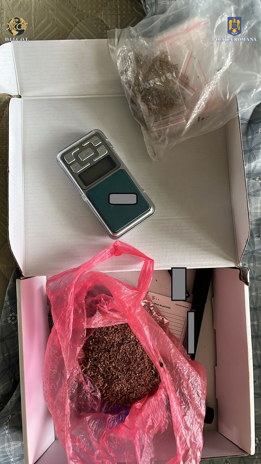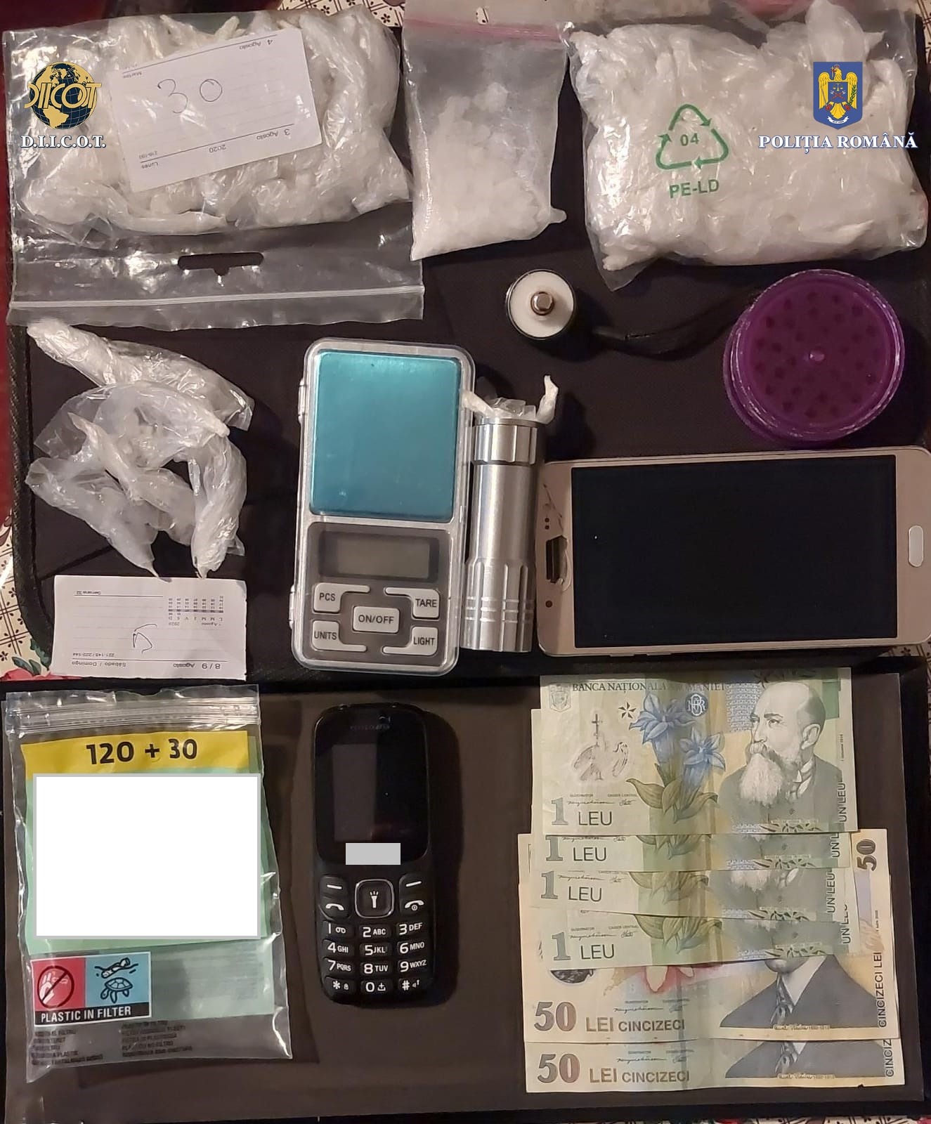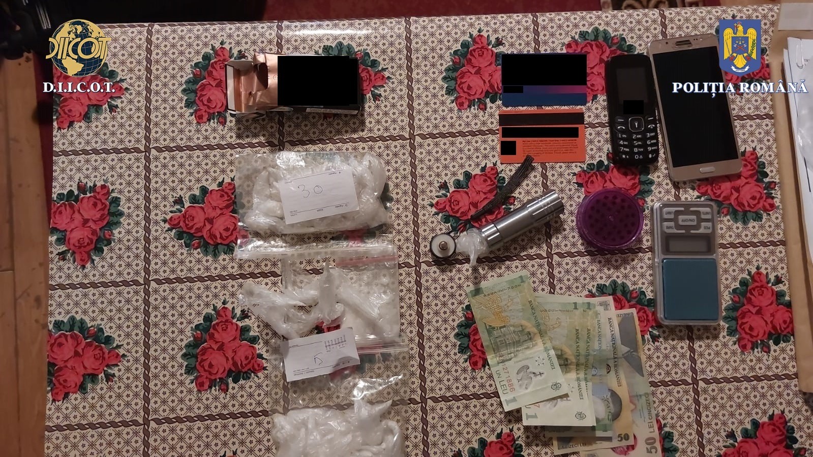 ‘Cu ocazia celor 9 percheziţii domiciliare efectuate la data de 9 martie în judeţele Iaşi, Suceava şi Cluj Napoca, au fost identificate şi ridicate 100 grame de canabis, 90 doze (aproximativ 80 de grame) de substanţe psihoactive noi (3 CMC), 5 coli impregnate cu JWH -210, 65 grame de substanţă vegetală impregnată cu JWH 210, 10 doze de canabis, un pistol airsoft, 4 cântare de precizie pe care s-au găsit urme de droguri, 10 telefoane mobile şi suma de 13.000 lei. În cursul zilei de astăzi urmează să fie sesizat judecătorul de drepturi şi libertăţi din cadrul Tribunalului Iaşi cu propunerea de arestare preventivă a celor 4 inculpaţi’, se menţionează în comunicatul de presă.