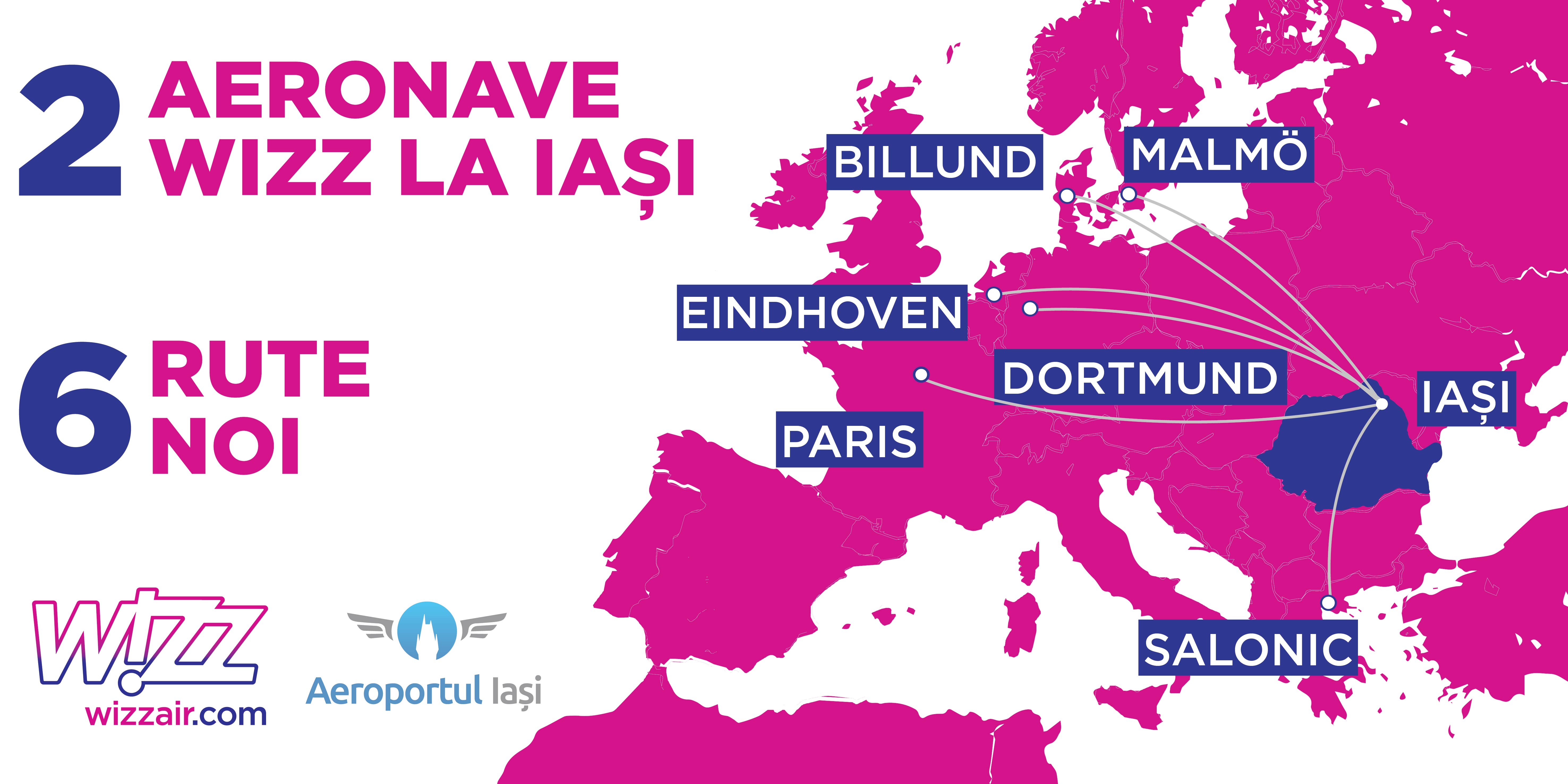 ‘Prin creşterea capacităţii cu 70% în 2018, WIZZ oferă acum 14 rute de la Iaşi şi aduce din ce în ce mai multe oportunităţi uimitoare clienţilor, pentru a călători cu cele mai mici tarife şi experimenta serviciile de calitate Wizz Air de la bordul aeronavelor. Întreaga echipă WIZZ este nerăbdătoare să întâmpine pasagerii la bordul oricăreia dintre cursele mult aşteptate spre Eindhoven, Dortmund, Salonic, Billund, Malmö şi Paris’, a spus Ratz.