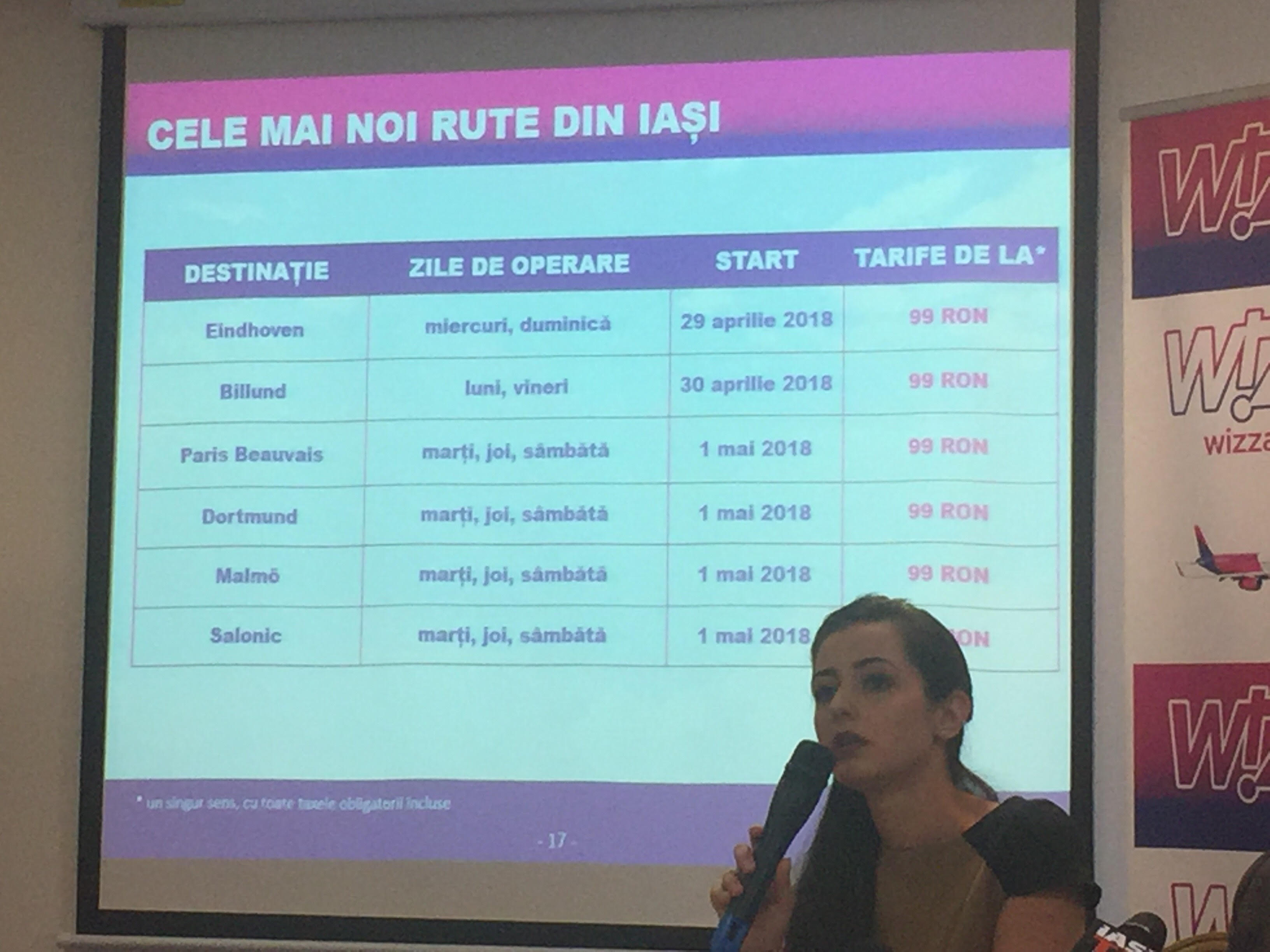 ‘Noua aeronavă va sosi pe 29 aprilie 2018 şi va asigura operarea zborurilor pe şase noi rute din Iaşi. Noile rute WIZZ spre Suedia, Olanda, Grecia şi Danemarca sunt singurele conexiuni directe din Iaşi cu ţările respective. Odată cu sosirea noii aeronave, frecvenţele pe trei dintre cele mai populare curse WIZZ din Iaşi vor creşte la patru/săptămână spre Tel Aviv şi Milano Bergamo şi la trei pe săptămână spre Roma Ciampino. Ca urmare a extinderii operaţiunilor sale la două aeronave moderne în 2018, Wizz Air va avea o echipă locală mai mare de 70 de angajaţi, iar noi sesiuni de recrutare au fost deja programate în septembrie, octombrie şi noiembrie, la Iaşi’, a declarat într-o conferinţă de presă Sorina Ratz, Communications Manager la Wizz Air.