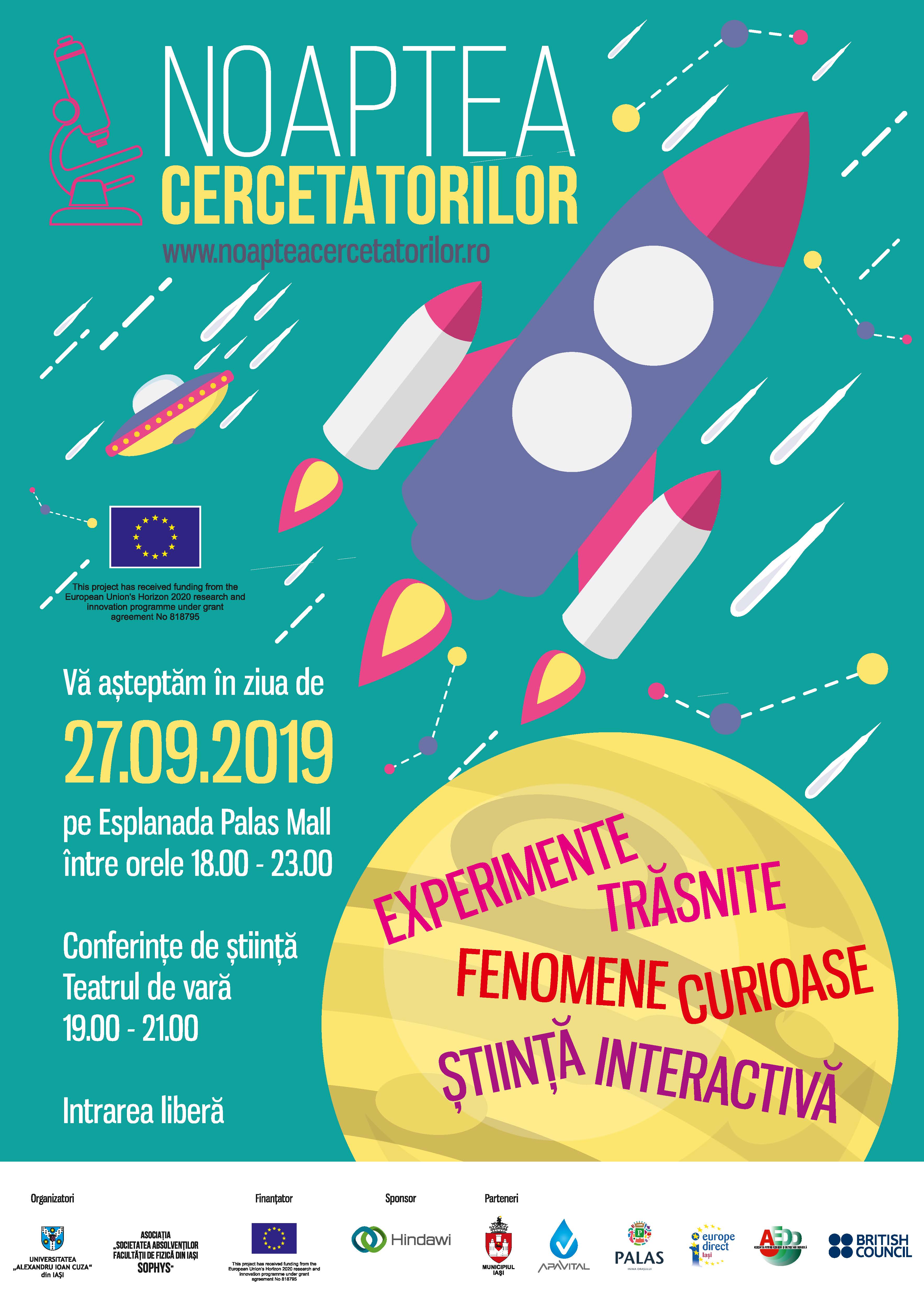 Cum arată un meteorit adevărat? La ce se gândesc peștii? Cum arată frigul pe o cameră foto? Acestea sunt câteva dintre curiozitățile ce vor fi prezentate la „Noaptea cercetătorilor”, eveniment ce va avea loc pe 27 septembrie, pe Esplanada Palas, cu începere de la ora 18.00. Ieșenii sunt invitați la o seară de știință, cu experimente spectaculoase, demonstrații live, activități interactive și prelegeri fascinante pe gustul și înțelesul oricui. Activitățile au fost gândite pentru mai multe categorii de vârste, de la copiii de școală primară până la adulți pasionați de cercetare. Intrarea va fi liberă.