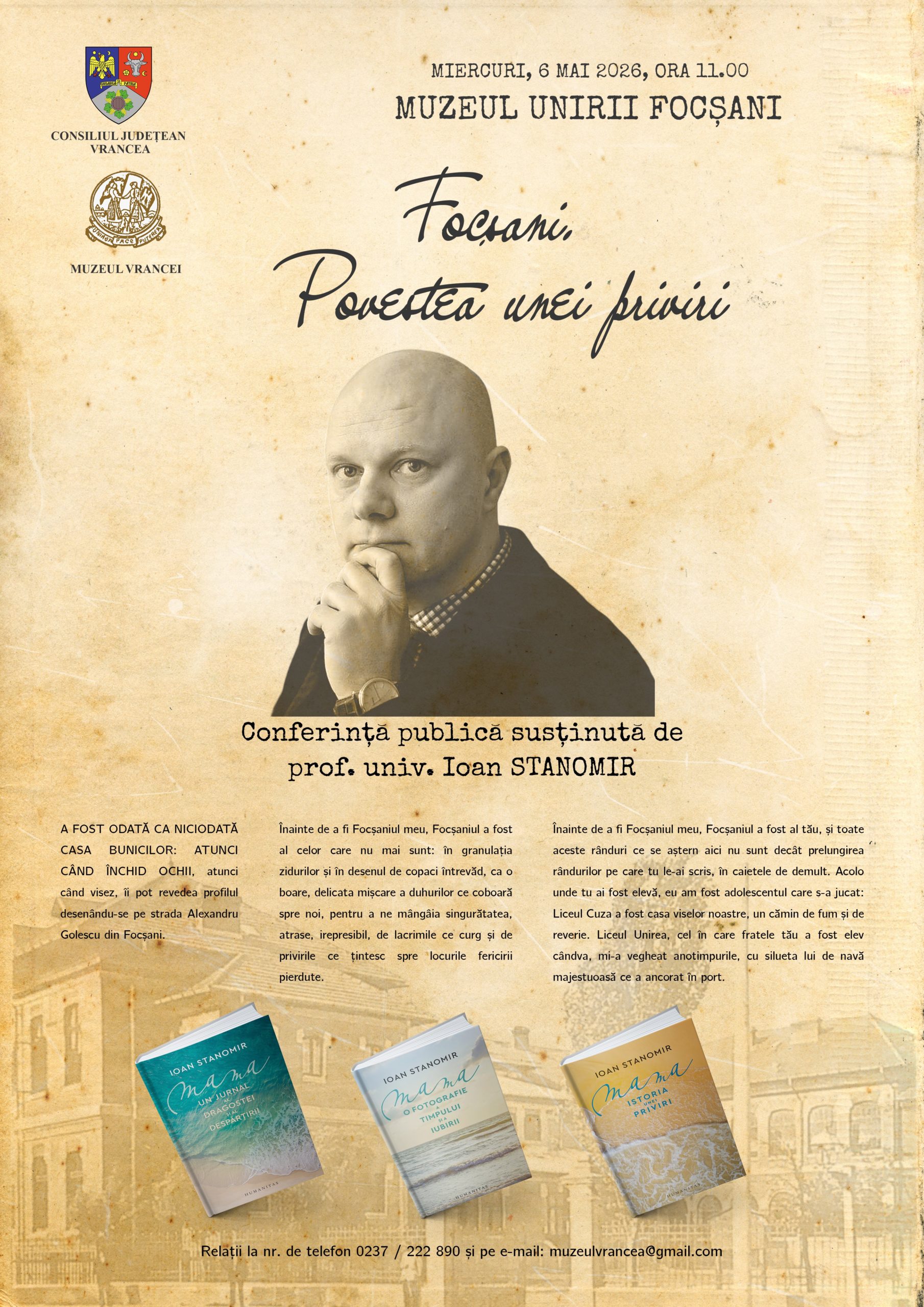 Consiliul Județean Vrancea, prin Muzeul Vrancei, vă invită miercuri, 6 mai 2026, la întâlnirea cu profesorul universitar dr. IOAN STANOMIR, autorul celor mai emoționante pagini despre Focșanii de altădată.