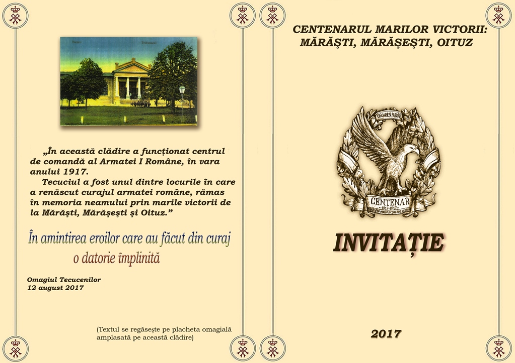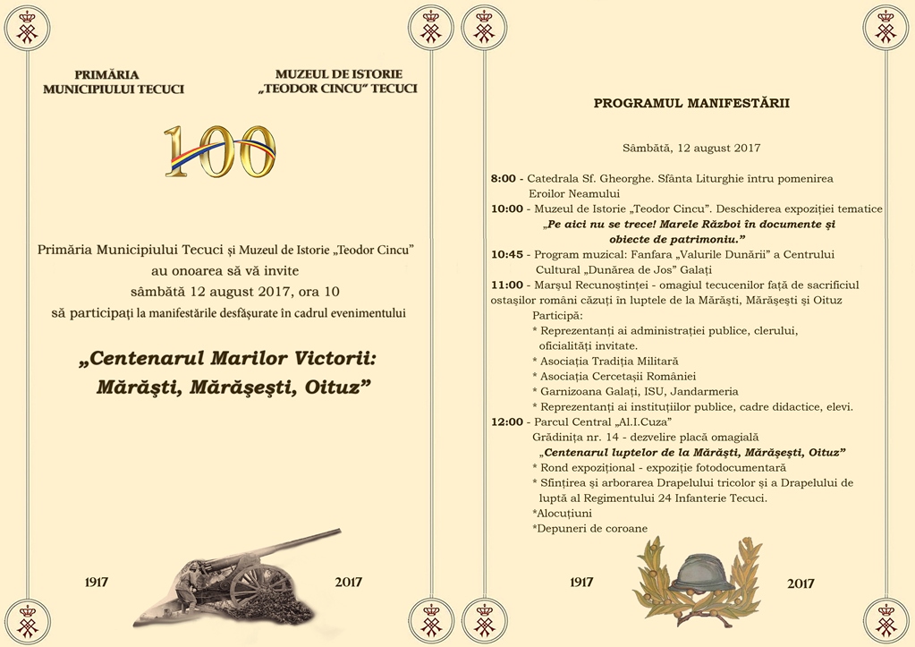 Primăria Municipiului Tecuci şi Muzeul de Istorie „Teodor Cincu” organizează, sâmbătă, 12 august, începând cu ora 10,00, o serie de manifestări în cadrul evenimentului „Centenarul marilor victorii de la Mărăşeşti, Mărăşti şi Oituz”.