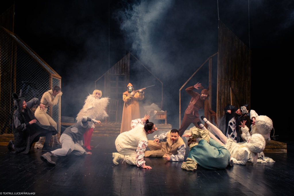„George Orwell a scris Ferma animalelor, subintitulând-o inițial o fabulă, în urmă cu optzeci de ani, dar subiectul este la fel de actual. Mirajul regimurilor totalitare seduce din nou masele, lideri cu tendințe autocrate sunt aleși în țări democratice. Ce putem face? Așa cum reiese din Ferma animalelor, răspunsul e simplu, dar complicat în același timp: educație.”, precizează regizorul Victor Olăhuț, care a făcut și decupajul dramaturgic. Din echipa de realizatori fac parte Bianca Veșteman (scenografie), George Pop (coregrafie), Marin Grigore (muzică). Distribuția îi include pe Viorel Vârlan (Domnul Jones, Whymper), Alex Iurașcu (Napoleon), Beatrice Volbea, (Snowball), George Cocoș (Squealer), Sebastian Pricop (Boxer), Elena Zmuncilă (Mollie), Claudiu Gălățeanu (Benjamin), Cosmin Rotariu (Câine), Camelia Dilbea (Câine, Reporter, O vacă), Ioana Iordache, Carmen Mihalache (Oi), Ionela Arvinte (Găină).