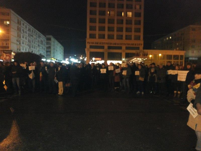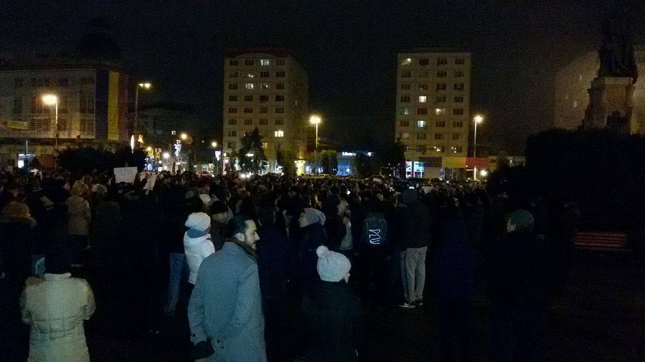 UPDATE ora 19:30 Protestarii s-au întors în Piața Unirii. Aproximativ 600 de oameni scandează lozinci împotriva guvernului.