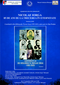 Muzeul Judeţean Botoşani organizează joi, 27 noiembrie 2025, ora 13.00, în amfiteatrul Colegiului Național „A.T. Laurian”, colocviul comemorativ „Nicolae Iorga – 85 de ani de la trecerea în eternitate”.