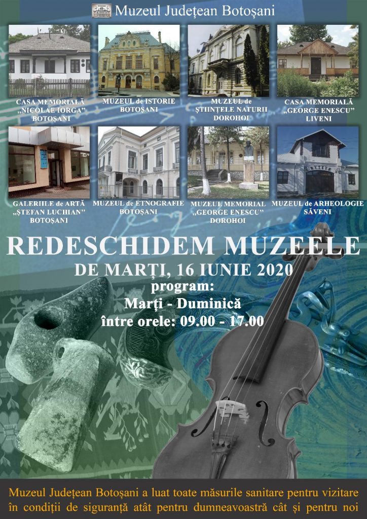 Vizitarea muzeelor din cadrul Muzeului Județean Botoșani, începând cu data de 16 iunie 2020, se va face de marți până duminică, potrivit programului obișnuit cuprins între orele 09.00-17.00. Intervalul orar 16.00-17.00 va fi destinat dezinfecției zilnice.