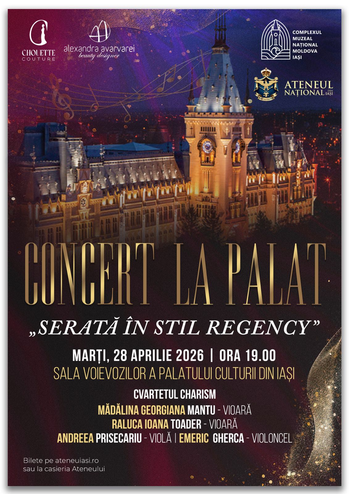 Pe 28 aprilie 2026, Cvartetul Charism propune o experiență inedită sub titlul „Serată în stil Regency”, un eveniment marcat de prezența costumelor de epocă și de o atmosferă istorică autentică. Programul muzical este dedicat adaptărilor clasice ale unor piese contemporane celebre, reinterpretate într-o manieră sofisticată, specifică balurilor de la începutul secolului al XIX-lea.