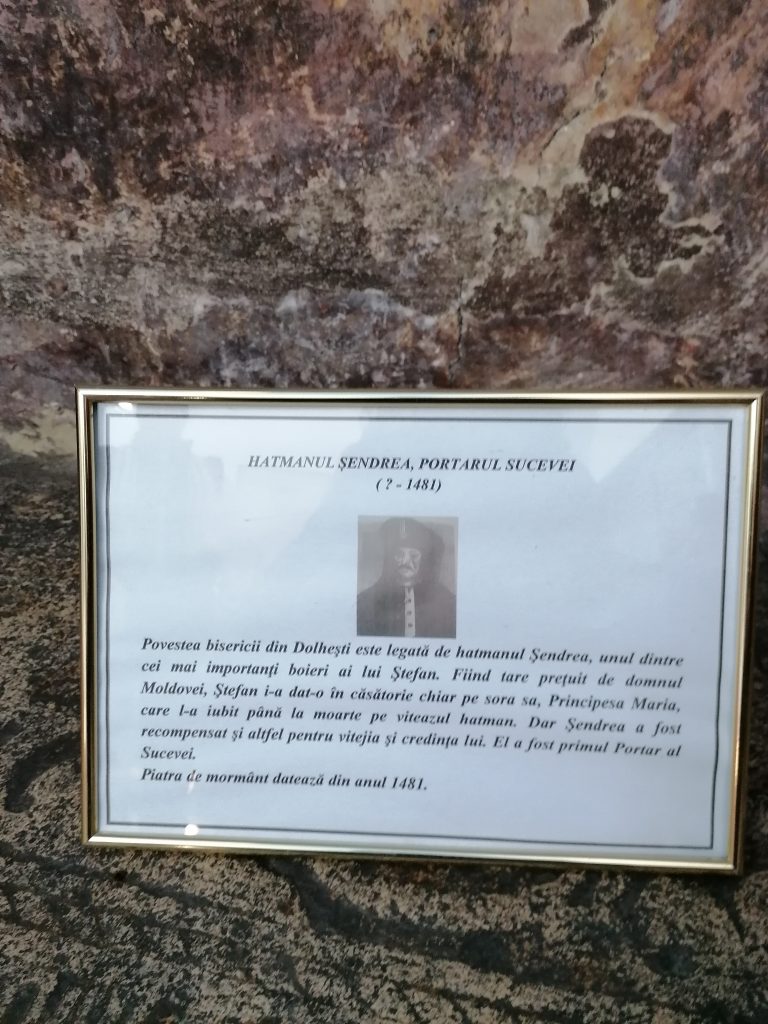 Boierii din familia Șendrea au zidit biserica actuală în mijlocul curții boierești din satul Dolheștii Mari, din vechea curte boierească nemaigăsindu-se nici o urmă vizibilă. Dar, în curtea actualei biserici, pe lângă monumentul ridicat în memoria eroilor proveniți din sat și alte construcții mai mici cu rol administrativ, există un edificiu cu o arhitectură aparte, căruia în acest an i s-a dat destinație de muzeu al satului, la inițiativa Preotului Paroh Iustin Vrabie, continuator în înțeleaptă păstorire al tatălui său, fost Preot Paroh tot în Dolheștii Mari.