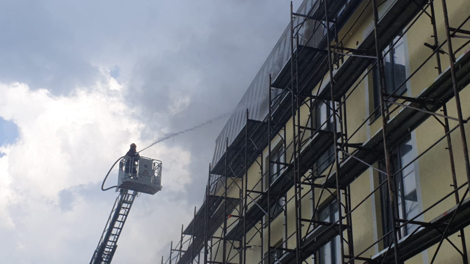 Zece maşini de pompieri au intervenit, joi după-amiază, pentru stingerea unui incendiu la acoperişul unui bloc care încă nu a fost dat în folosinţă