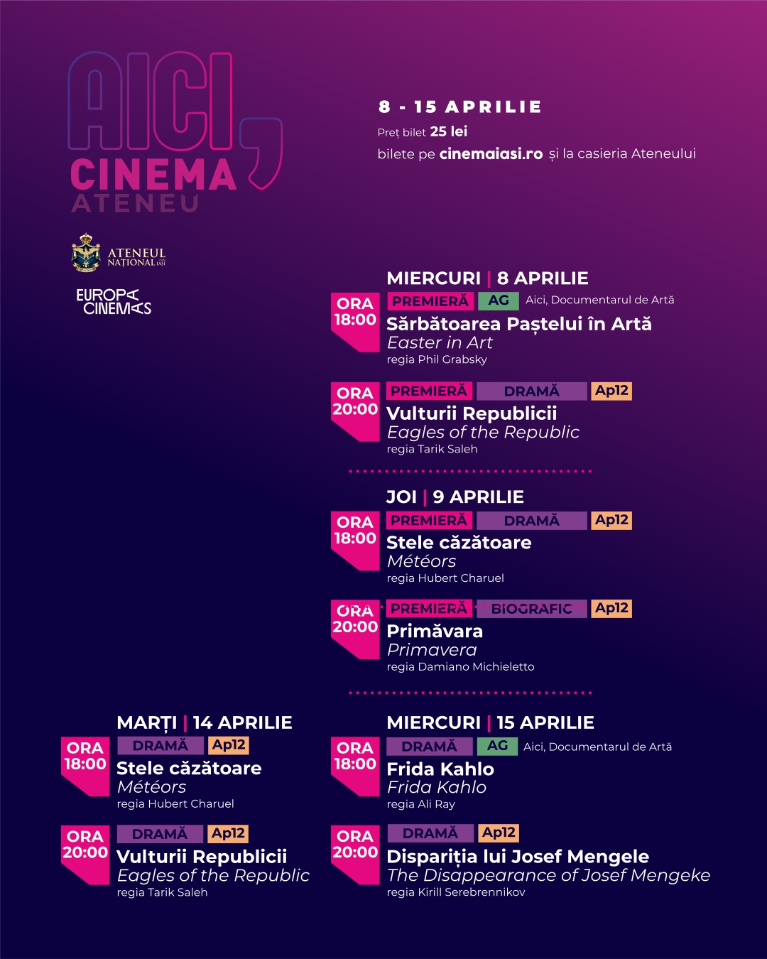 Vă transmitem programul săptămânal al proiecțiilor de la Cinema Ateneu Iași pentru perioada 8-15 aprilie 2026.