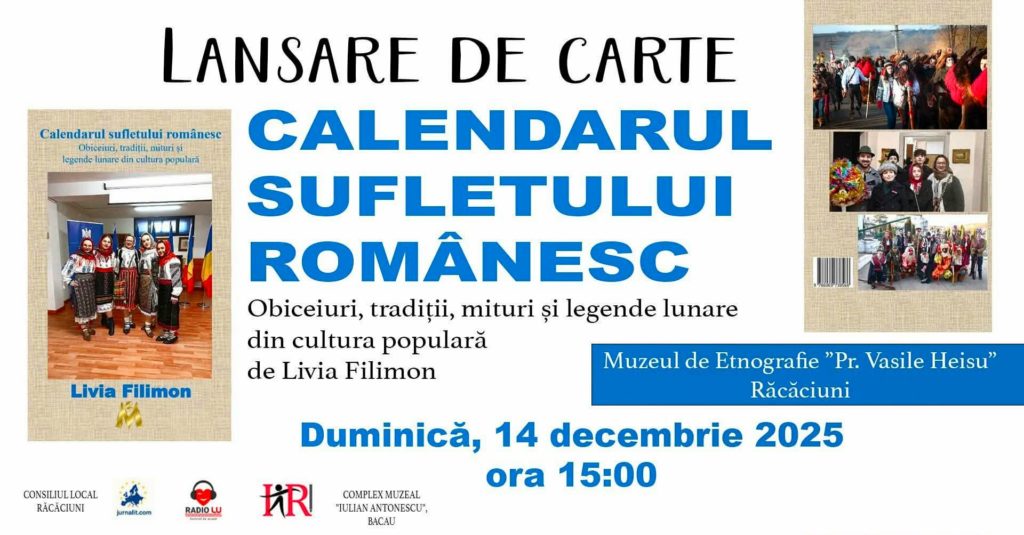 Ieri, premiați la București, astăzi Livia și Florin Filimon, deja, adresează o invitație pentru duminică, 14 decembrie 2025, ora 15:00, la un eveniment cultural în Răcăciuni, județul Bacău, inspirat de o recență realizare în Torino – Italia: cartea ”CALENDARUL SUFLETULUI ROMÂNESC”. Obiceiuri, tradiții, mituri și legende lunare din cultura populară”, autoare Livia Filimon