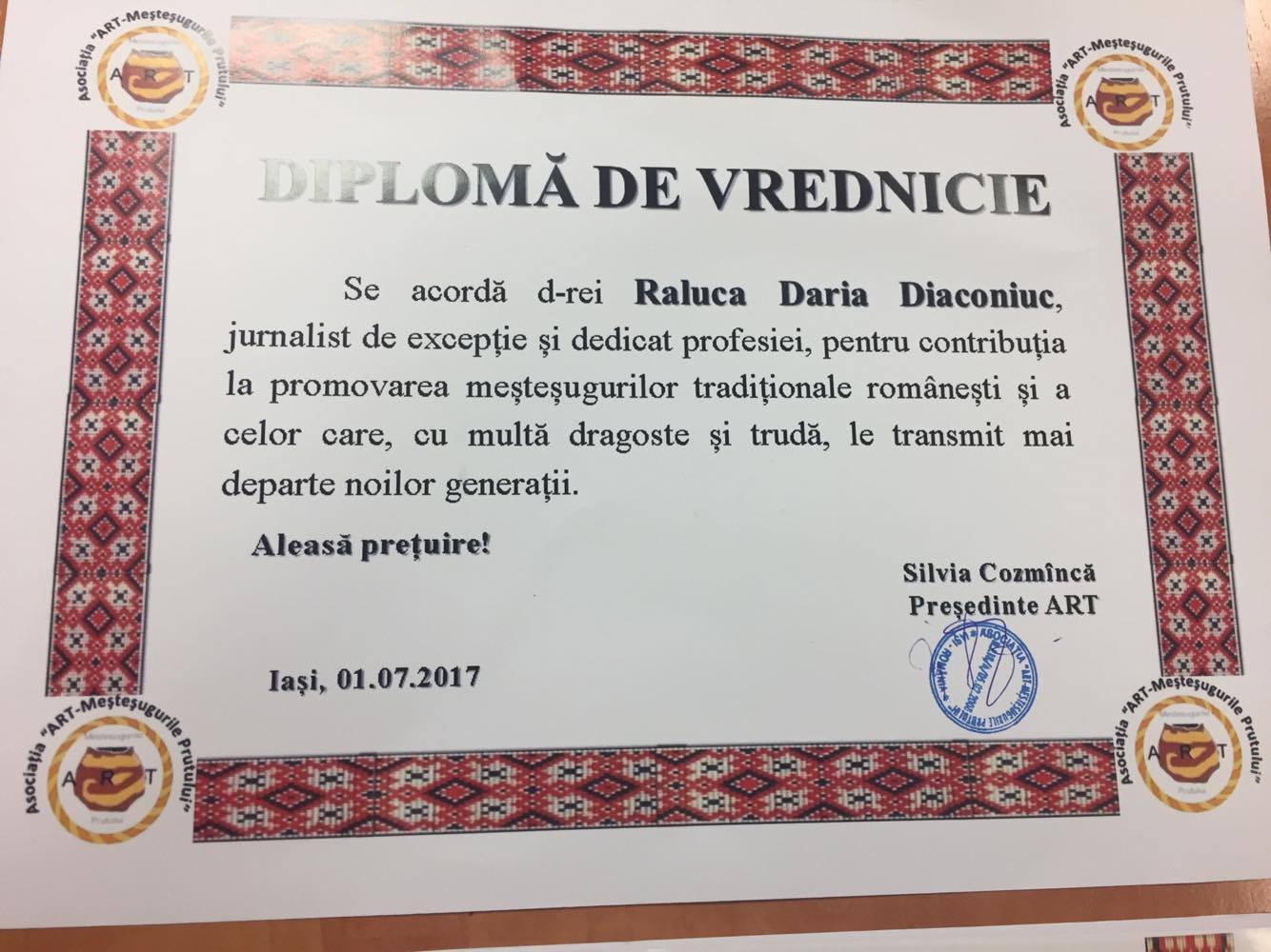 Asociația ART-Meșteșugurile Prutului a acordat colegei o distincție importantă colegei Raluca Daria Diaconiuc pentru promovarea activităților asociației din ultimii ani.