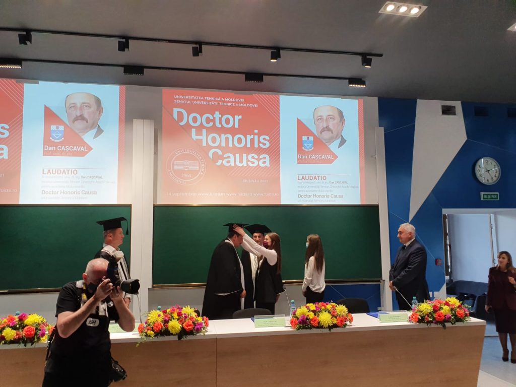 Prof. univ. dr. ing. Dan Cașcaval, rectorul Universității Tehnice „Gheorghe Asachi” din Iași (TUIASI), a primit cea mai înaltă distincție academică – Doctor Honoris Causa – din partea Universității Tehnice a Moldova (UTM). Ceremonia a avut loc marți, 14 septembrie 2021, la sediul universității din Republica Moldova.