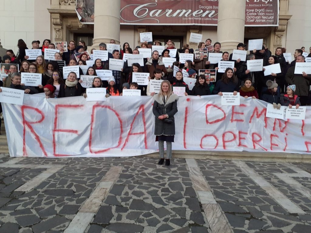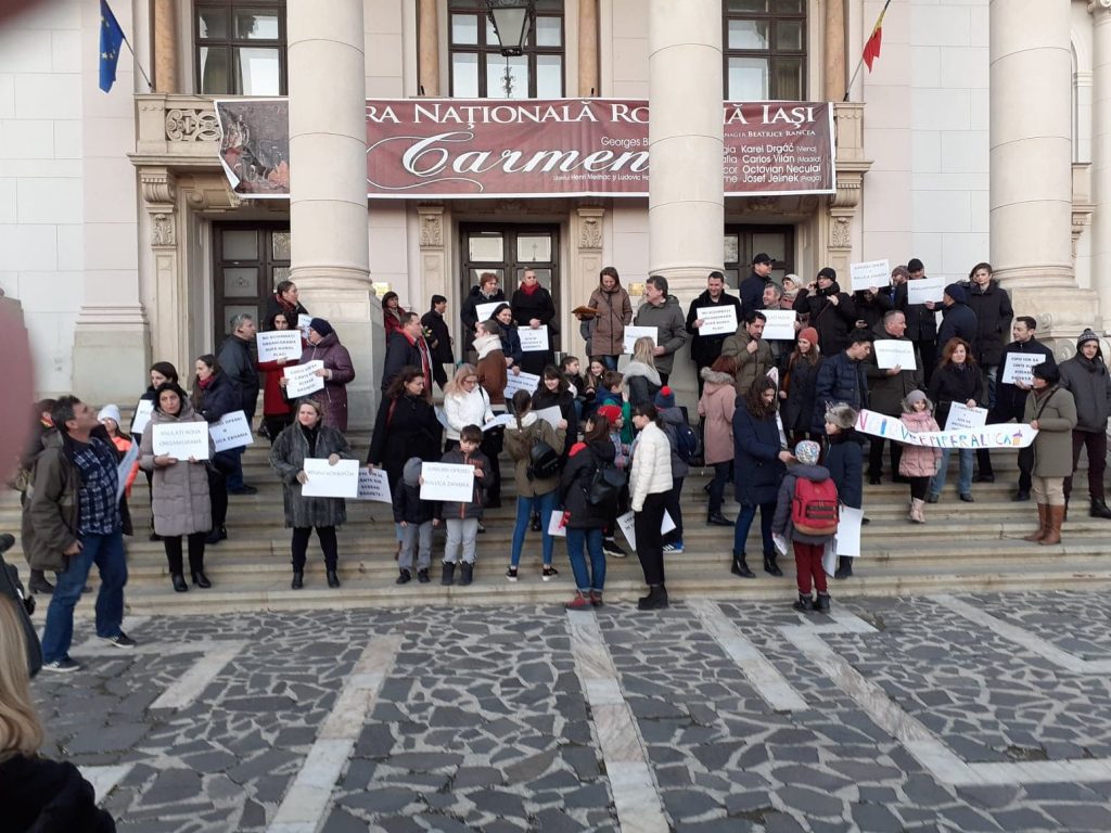 Un nou protest a avut loc, în această seară, în faţa Operei Naţionale din Iaşi, chiar înaintea reprezentaţiei cu spectacolul “Carmen” de Bizet.