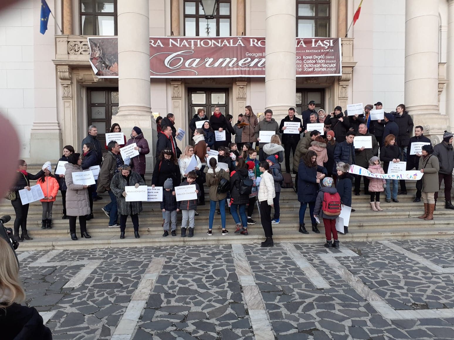 Un nou protest a avut loc, în această seară, în faţa Operei Naţionale din Iaşi, chiar înaintea reprezentaţiei cu spectacolul “Carmen” de Bizet.