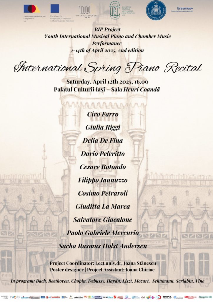 Cea de-a II-a ediție a proiectului Youth International Musical Piano and Chamber Music Performance, derulată în cadrul ERASMUS+ BIP Project, reunește opt profesori de prestigiu din academii europene și 15 studenți internaționali, oferindu-le oportunitatea de a participa la masterclass-uri, sesiuni intensive de studiu, conferințe tematice și recitaluri. Profesorii invitați sunt Frank – Immo Zichner (Germania), Eugenio Catone (Italia), Łukasz Dębski (Polonia), Mariam Kharatyan (Norvegia), Giulio Potenza (Italia), Dragos Andrei Cantea (Norvegia/ România), Ana Telles (Portugalia), Ioana Stănescu (România).