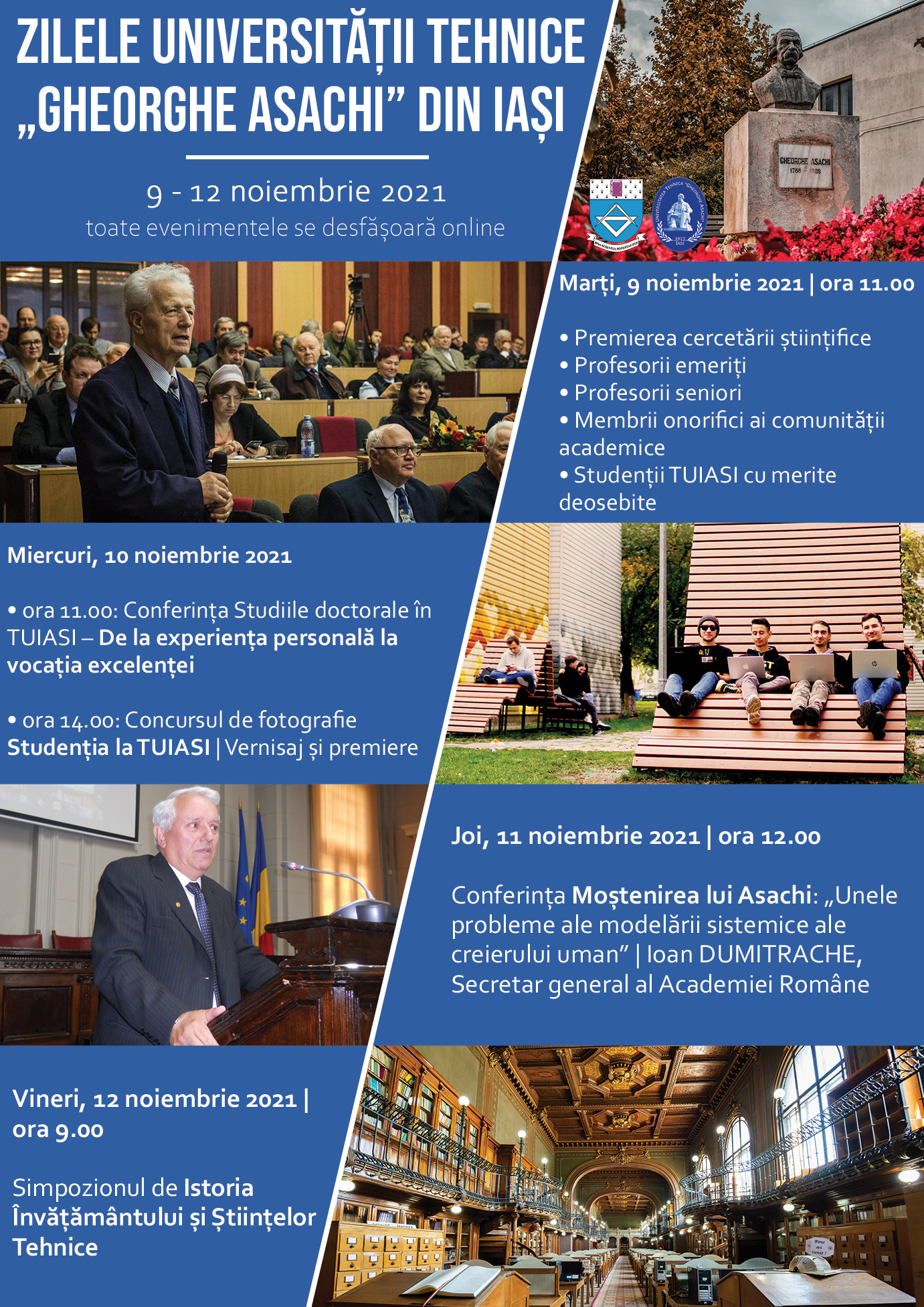 Pentru a marca aceste momente, în perioada 9 – 12 noiembrie 2021, vor fi organizate o serie de manifestări devenite, de-a lungul anilor, tradiție. Dată fiind pandemia COVID-19 și măsurile restrictive impuse la nivel național, conducerea TUIASI a luat decizia de a desfășura integral online toate aceste evenimente, pentru protejarea tuturor participanților.