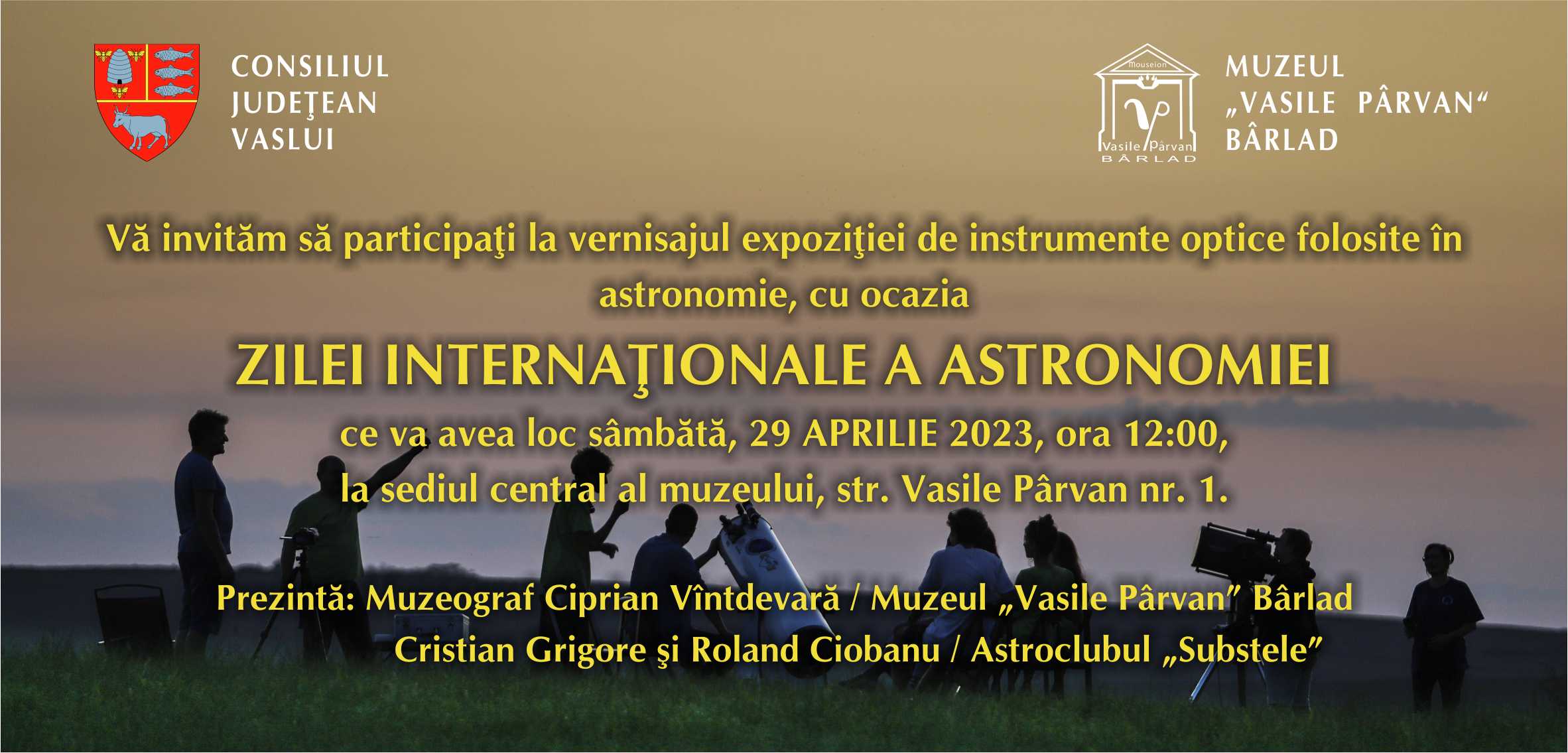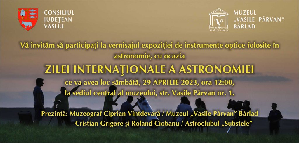 Sâmbătă pe 29 aprilie 2023, Muzeul „Vasile Pârvan" din Bârlad, vă invită să participaţi la Ziua Internaţională a Astronomiei (Astronomy Day).