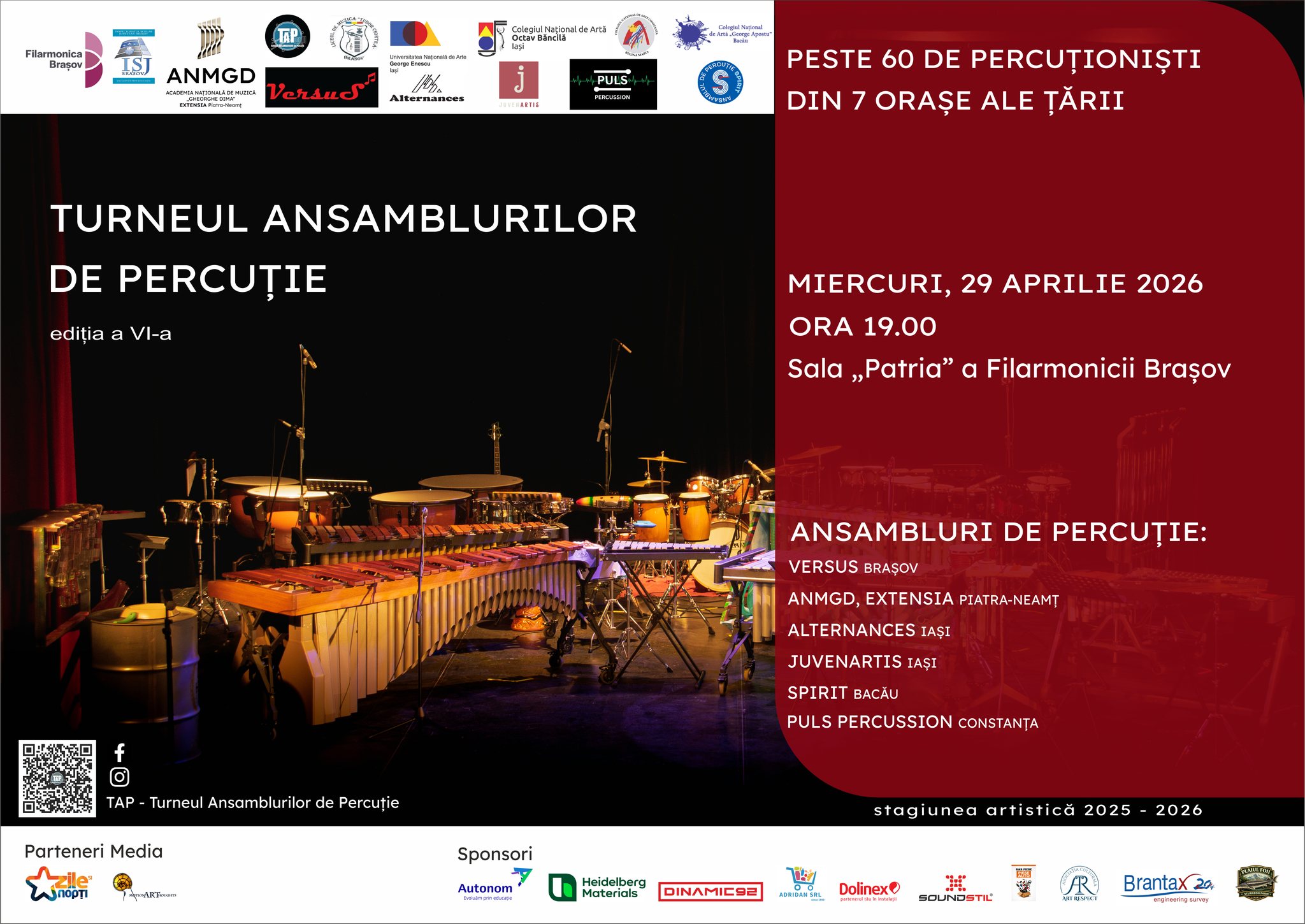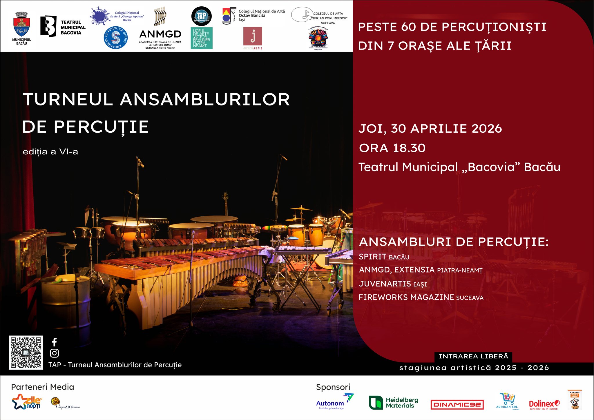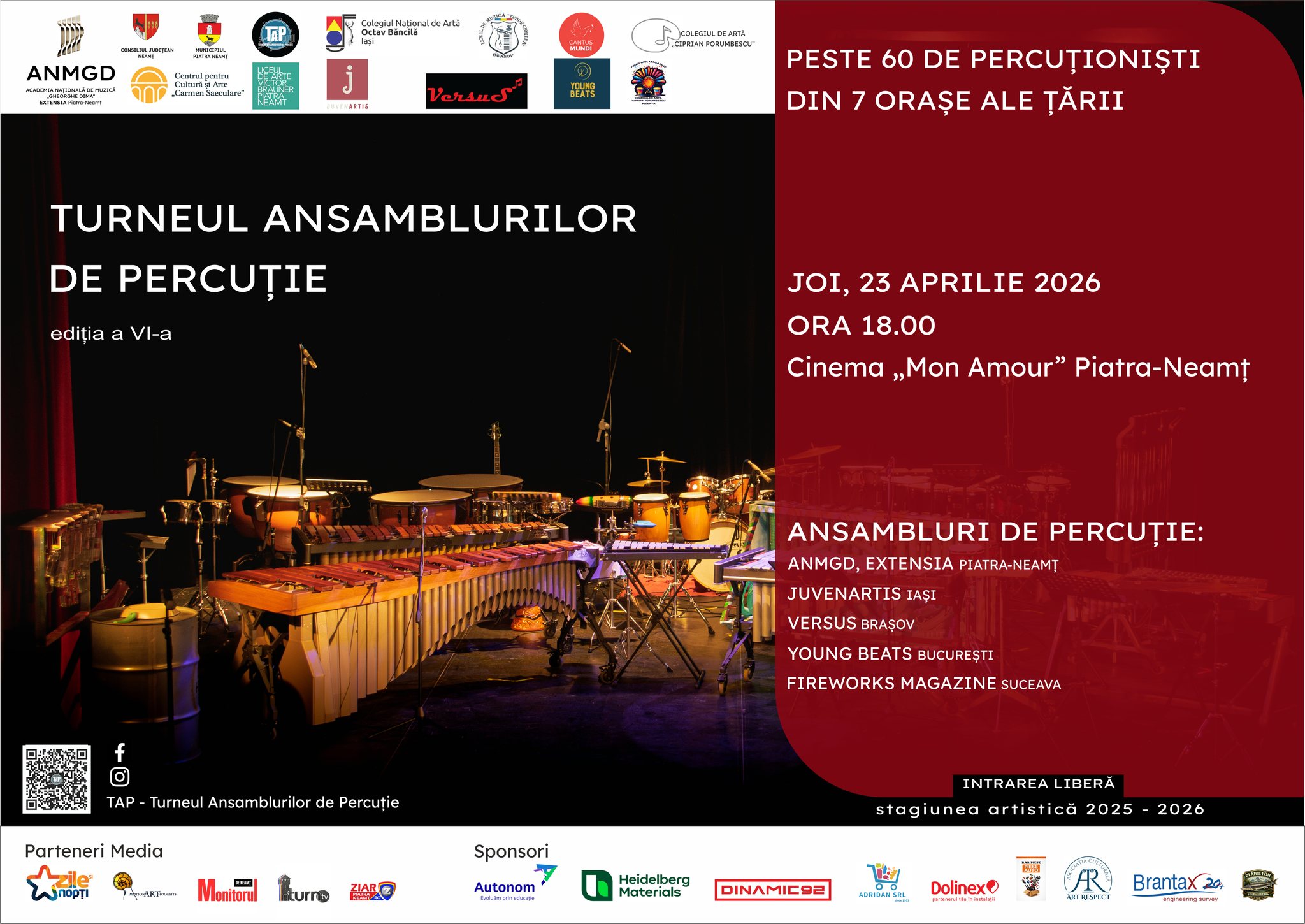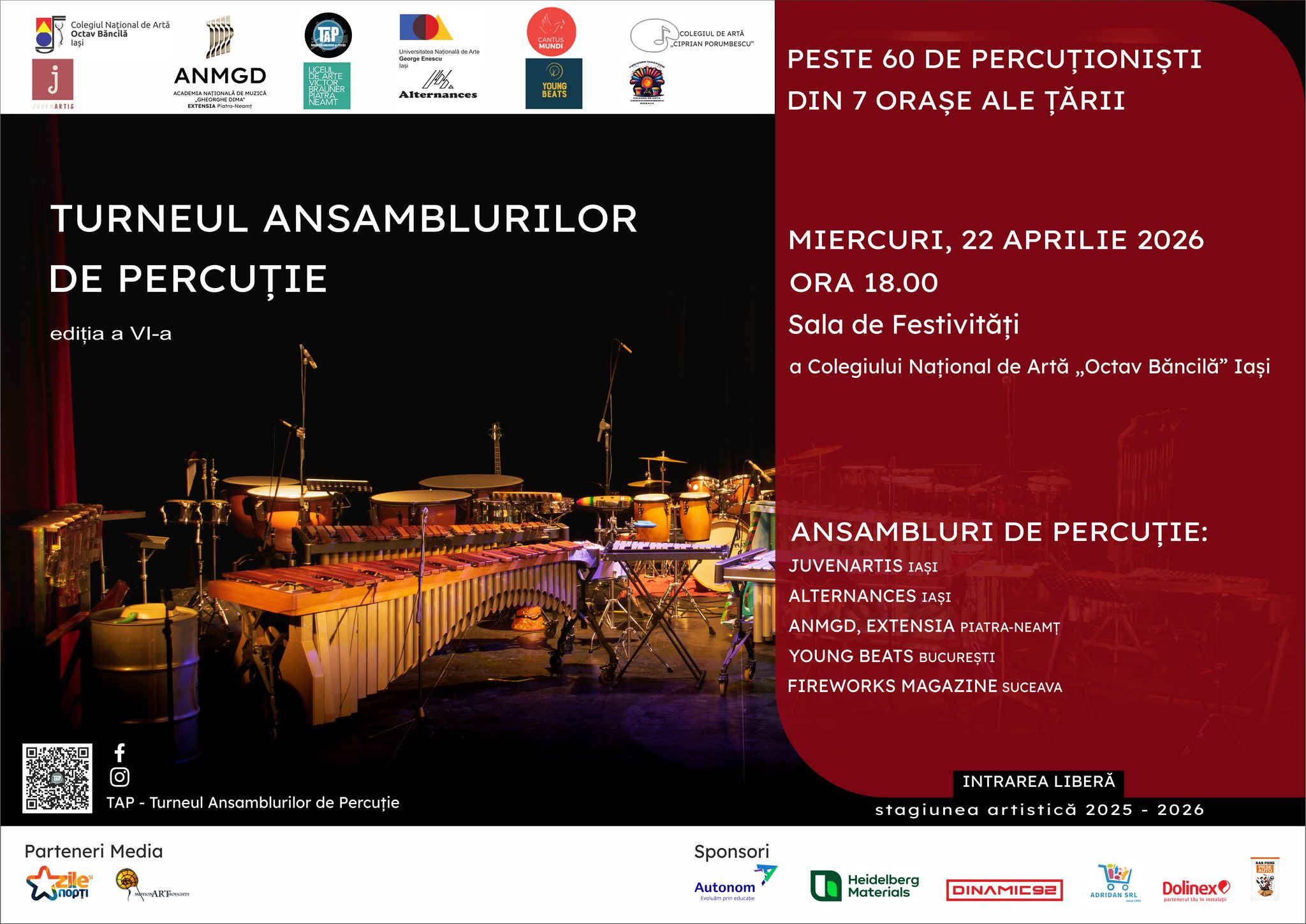 Cea de a patra ediție a Turneului Ansamblurilor de Percuție, inițiat de muzicianul Alexandru Veleșcu, se desfășoară în perioada 22 aprilie – 29 mai 2025 și include concerte în șapte orașe: Iași, Piatra Neamț, Constanța, Brașov, Bacău, București, Suceava.