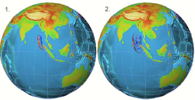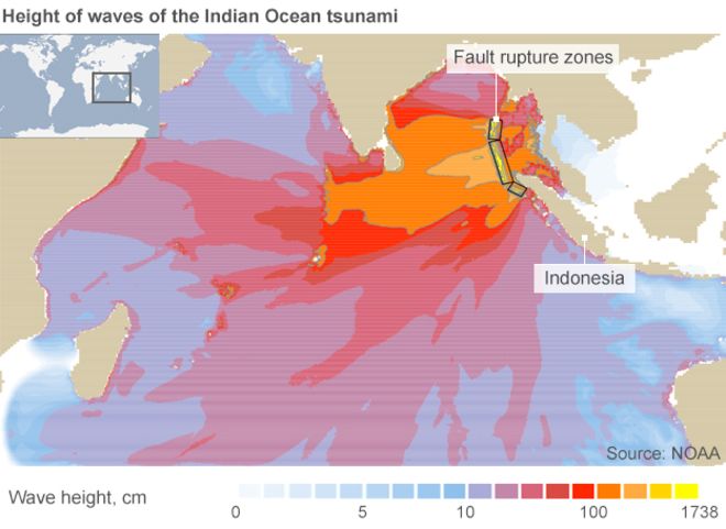 Cutremurul a radiat în Oceanul Indian, din Indonezia în Sri Lanka și dincolo, a rupt zăgazurile oricărui record înregistrat până atunci – cea mai mare lungime, pe o distanță de aproximativ 1.500 km (900 mile)/suprafață mai întinsă decât aceea a statului american California. Ruptura s-a produs sub epicentrul cutremurului și a progresat, spre nord, de-a lungul acestuia, cu aproximativ 2 km/secundă și durata de aproximativ 10 minute[2]; lungimea rupturii a însemnat că valurile ajunseseră într-o zonă geografică mai largă (până aproape de Mexic, Chile și zona arctică). La ora locală 07:58 (00:58 GMT), miliarde de tone de apă s-au îndreptat către țărmuri, cu viteze terifiante[3]; unele rapoarte insistau pe faptul că valurile au ajuns la o înălțime de 9 metri (sau chiar mai mare) atunci când au lovit țărmul[4]