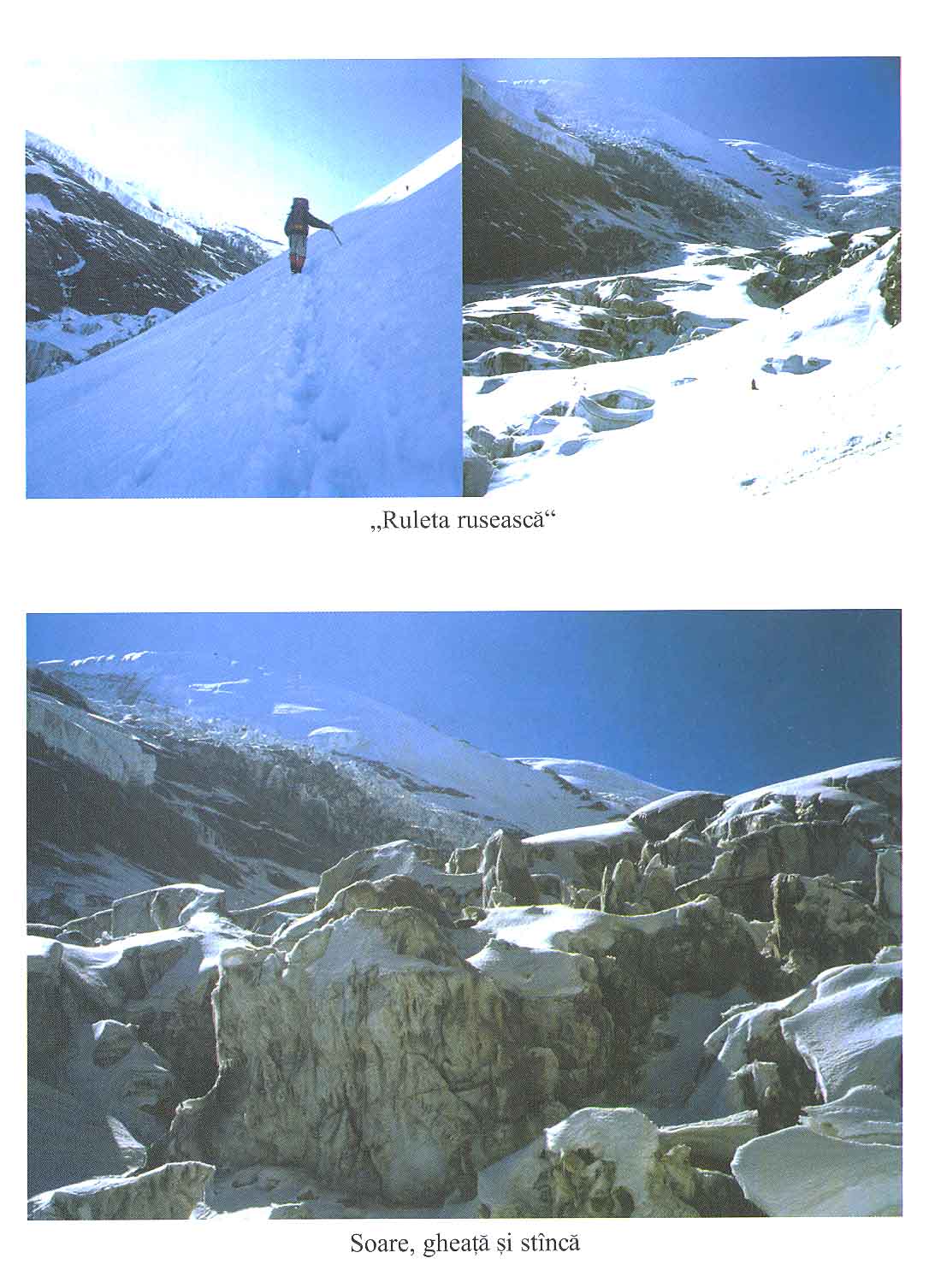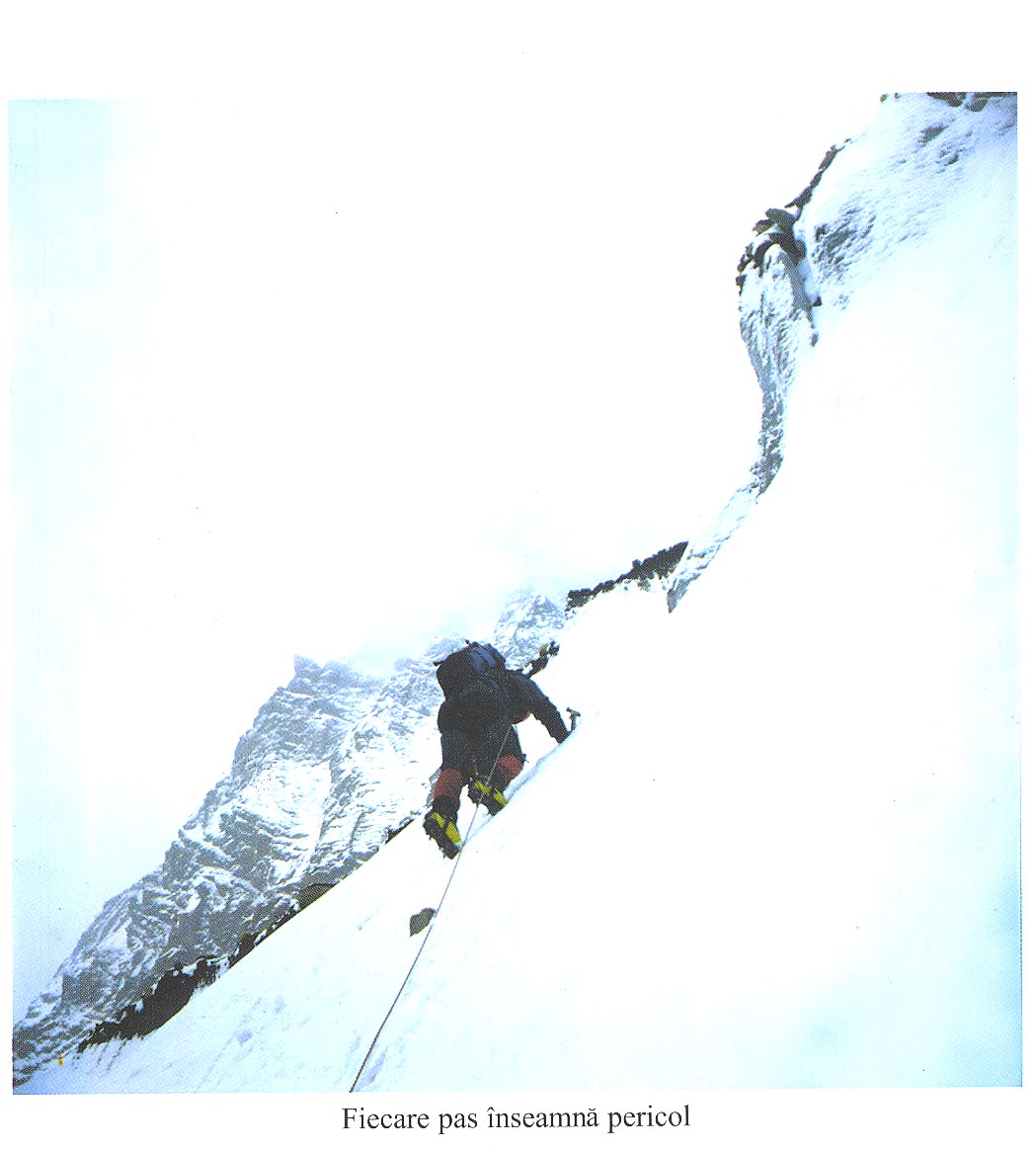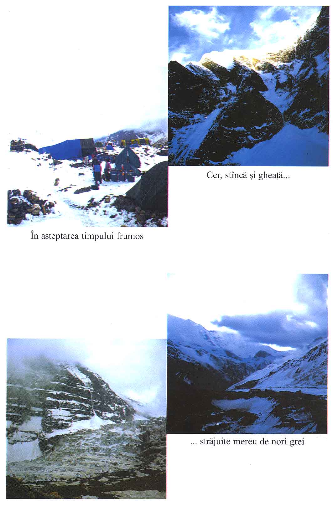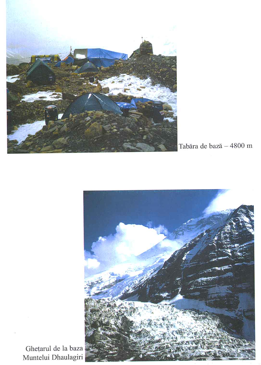 ,,Sufletul ţi se strânge… Frământat de întrebări, este cuprins de presentimente sumbre… Singurătate… Liniște… Zgomote stranii se învălmăşesc în ecouri ciudate… Vântul şi vârtejul dansului, diabolic pe alocuri… Noi nu ne comparăm cu echipa originară din Coreea de Sud – aceasta a trimis înainte doi şerpaşi, pregătind întreg traseul. Sponsorul şi-a făcut apariţia cu elicopterul închiriat din Kathmandu, mai mult, a stat o săptămână în tabăra de bază, încurajându-şi „protejaţii”, vorbind la fiecare pas despre recompense regale. În tabăra II a început furtuna… Ştiam că e foarte grav să rămâi pe traseu. Ningea şi nu puteam să ne retragem spre tabara I, zăpada era abundentă, avalanşele erau pregătite oricând să-şi arate colţii… Nu se vedea nimic şi ma gândeam la golurile de l.000-l.500 de metri; trebuia să ţinem creasta, să găsim corturile. Plecasem de la 6 dimineaţa, nu reuşeam să ne băgăm în zăpadă, aveam nevoie de lichide. Ne-am oprit. Disperaţi că nu puteam ajunge la staţiile de emisie-recepţie, pentru a anunţa tabăra de bază! Săpăm la 6.800-6.900 de metri. În tabăra I am dus patru corturi, saci de dormit, mâncare, procedând identic în tabăra a II-a. Tot traseul era montat… După ce ne-am trezit blocaţi aproape 12 zile în tabăra de bază, prima tentativă spre vârf a aparţinut echipei având următoarea componenţă: Sorin Baciu, Lucian Constantinescu, Aurelian Vivirschi. Ajungând la tabăra I ne-a fost dat să vedem doar 5 centimetri din cortul instalat (restul fusese acoperit de zăpadă). Au urmat 5 ore de coşmar, timp în care luptam cu zăpada, pentru a fi în măsură să intrăm în adăpostul situat la 5.800 de metri altitudine. A scos atâta zăpadă încât se formase un adevărat crater. A doua zi, porneam spre tabăra a II-a. Intersectându-ne cu echipa italiană, am aflat că aceasta renunţase înainte de tabăra II. S-a iscat o asemenea furtună încât nu desluşeam corturile taberei, deşi ne-au despărţit de ele doar zece metri. Imaginaţi-vă efortul pe care trebuie să-l faci la 6.800 de metri pentru săparea unui spaţiu izbăvitor. Până la urmă, ne-am înghesuit fiecare într-un singur cort (spun înghesuit, din cauza presiunii fabuloase a zăpezii, furtuna fiind în toi). În acea noapte, nu am fost chiar la un pas de moarte. Ne făceam tot timpul ceai şi supă pentru a nu ne deshidrata. A doua noapte, după ce am săpat câteva ore, am adormit. Amorţeala punea stăpânire şi pe schimbul meu la săpat… Visasem că mă sufoc şi, deodată, m-am trezit. Pipăind pereţii cortului, mi-am dat seama că eram complet acoperit de zăpadă. Lovind cu pumnul într-o zonă a cortului, mi-am făcut puţin loc. Am reuşit să respir… În acea seară, nimeni nu a reuşit să adoarmă. Fără a avea echipa de sprijin în spatele nostru (cealaltă „formaţie” nu părăsise tabăra de bază) am renunţat la ascensiune La asemenea altitudine, pulsul şi tensiunea scad foarte mult. Încălzirea mâinilor şi picioarelor nu se mai face brusc. Din această cauză apar degerăturile, albirea părţii terminale a degetelor. În condiţiile unei degradări complete, amputarea este singurul <<leac>>. În cort, am fost anunţaţi că vântul, viscolul şi ninsoarea pun stăpânire pe Dhaulagiri. După două nopţi (practic, trei zile pline) de chin, nu am renunţat, am vrut să facem următorul pas spre tabăra a III-a. Nicio şansă… Potenţialul forţelor latente ale voinţei şi vitalităţii umane nu mai era de niciun ajutor. Mai târziu, colegii s-au hotărât să <<atace>>, dar când au ajuns la altitudinea taberei III, constatau că ea nu mai există. Şi tabăra IV fusese spulberată de furtună. Au urmat nopţi dramatice… Totul era acoperit de zăpadă (jumătate de metru şi chiar un metru, pe alocuri). La coborâre, puteai fi măturat de avalanşă. Rămăsesem pentru puţin timp în tabăra de bază, pregătiţi să ne constituim în echipa de sprijin pentru colegii noştri. La limita efortului psihic, ne plimbam în jurul cortului… Când a plecat cealaltă echipă, intuiam că va avea de înfruntat aceleaşi mari probleme. Ciuldin, marele ghid profesionist, a renunţat la tabăra IV. Lucian şi Ticu au ştiut că pot atinge vârful, dar şi faptul că, odată împlinit acest vis, pentru ei nu mai exista cale de întoarcere… ”