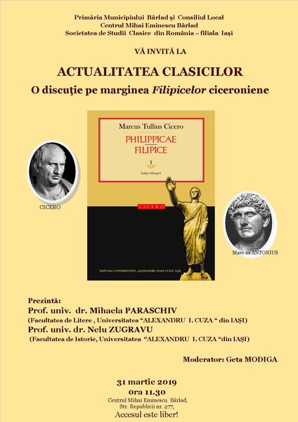 Duminică, 31 martie 2019, ora 11:30, Centrul „Mihai Eminescu” din Bârlad organizează manifestarea „Actualitatea clasicilor. O discuţie pe marginea Filipicelor ciceroniene„.
