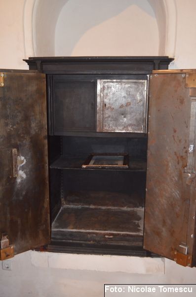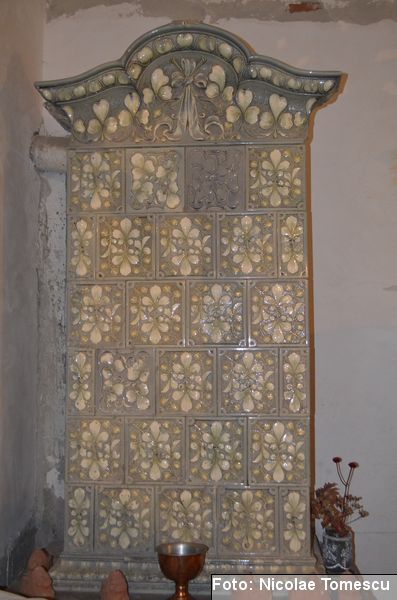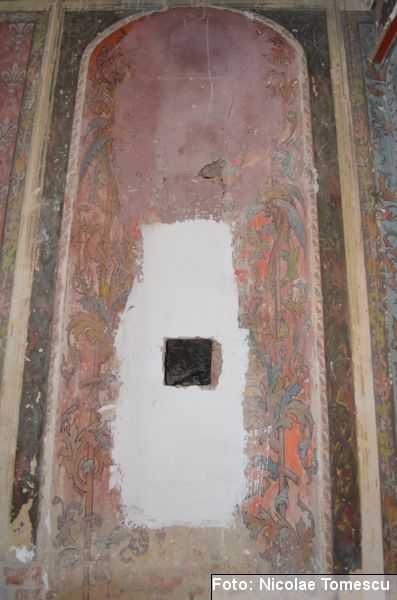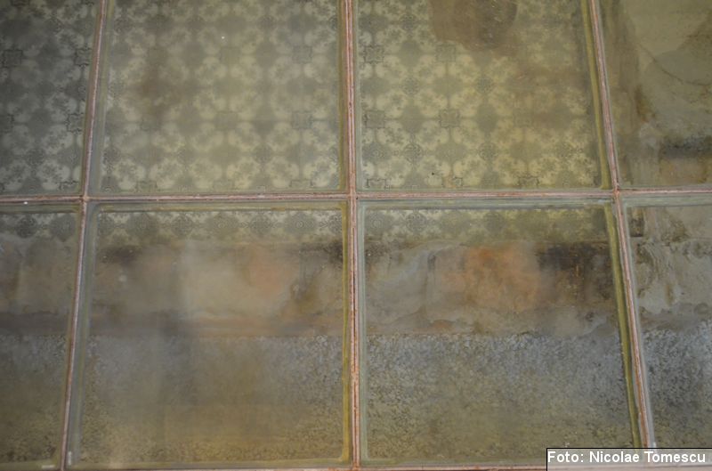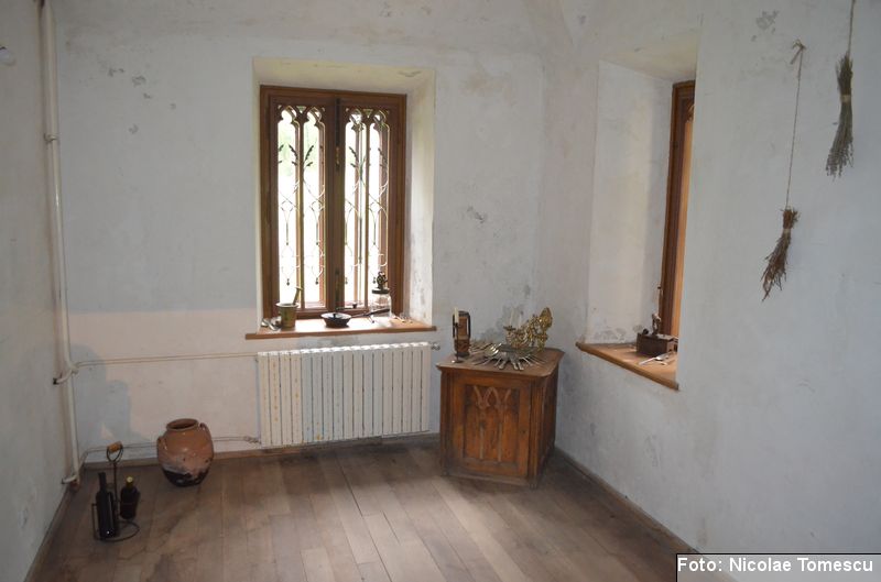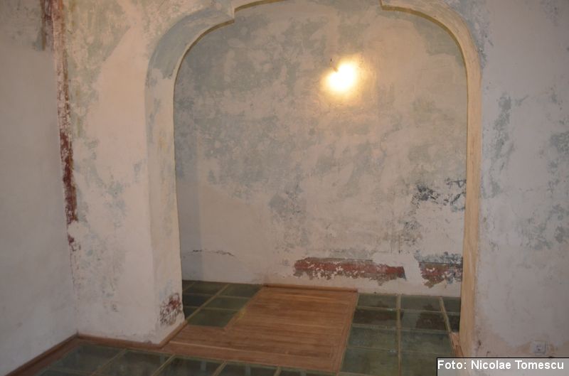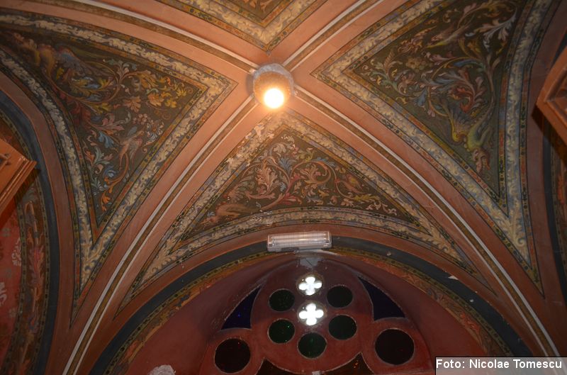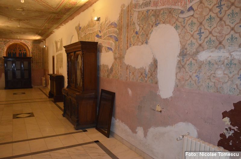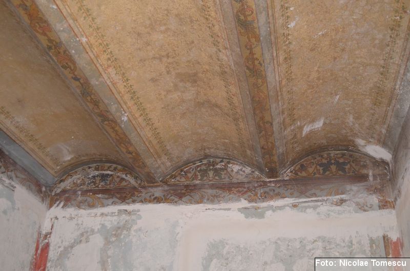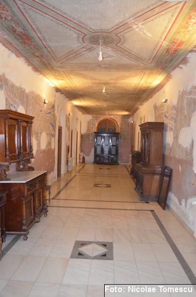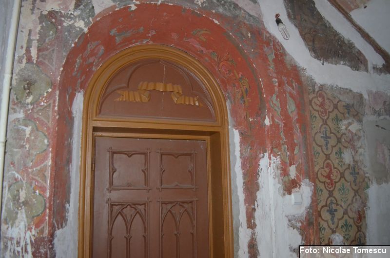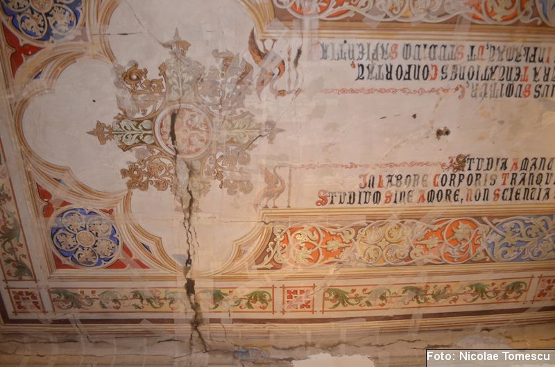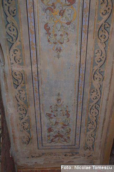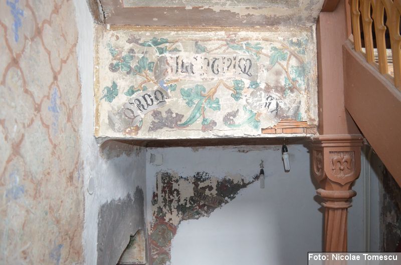 [18] Pe pietrele încastrate în pereți se află: inscripția de pe pisania vechii biserici construite de vel-vornicul Ioan Sturza (în limba română, cu caractere chirilice): Această sfăntă beserică întru care se prăznuește seborul sfinților celor fără de trup îngeri Mihail și Gavriil care din temelie sau ziditu de dumnealui Ioan Sturze vel-vornic fiul Sandului Sturze vel-logofătu la leat 1782; o inscripție în limba latină: Alexander Demetrius pater cu consorte Catherina (stirpe nostra Ruginosensi) 1809-1848-1865 et filii Demetrius, Mathaeus, Georgius, una cum sororibus Helena, Zoe, Roxandra. Eodem traditionibus spiritu incepta prosequiiti, amorem continuaverunt. adornaverunt MDCCCXXX – MDCCCLXIII; o inscripție în limba latină: Ardentisimo desiderio nihil nobis potius quam ut posteri, dilectisima filia Catharina una cum consorte Serbano (gente Cantacuzeno Florestiensium) nec non una cuum filio adoptivo Mathaeo eodem spiritu afflatu loco aris focis sacris colendis amorem impendentes prosequuntur vivant, floreant, crescant; o altă inscripție în limba latină: Iohanes Sandus atavus fundator et parens locis hujus domusque cultus quo ex tempore nostrarum rerum familiarum catena continuata, traditionibus firmata, sacris penatibus corroborata MDCL – MDCCL * Demetrius Iohanes avus una cum filiis Theodorus Constantinus (ejusque filius Demetrius) germanorumque fratrum natu minor Alexander locum focum sacra amoris zelo continuaverunt MDCCL – MDCCCXLVIII. În stânga intrării în încăpere se află încastrată o piatră cu următoarea inscripție: Prosapias veteres non in parietibus incisis, sed aris focis. Sacrisque cultis continuanda atque genuina probanda. MCMVIII…