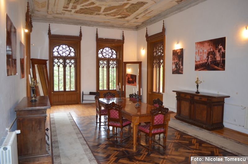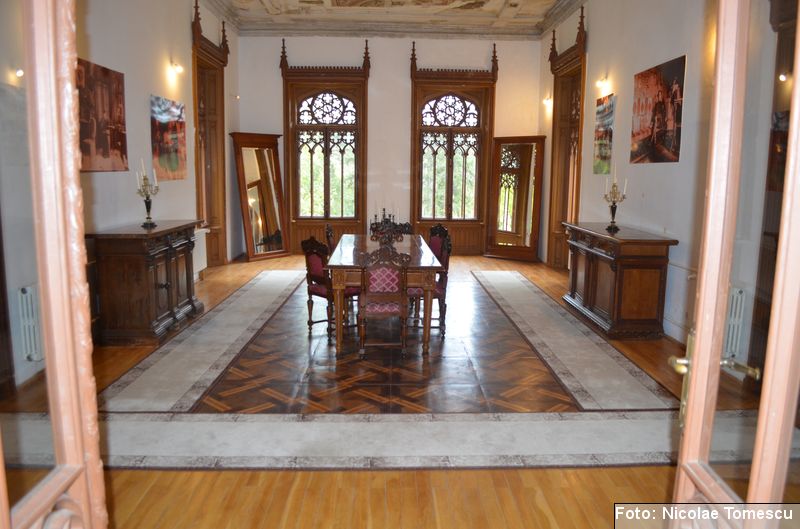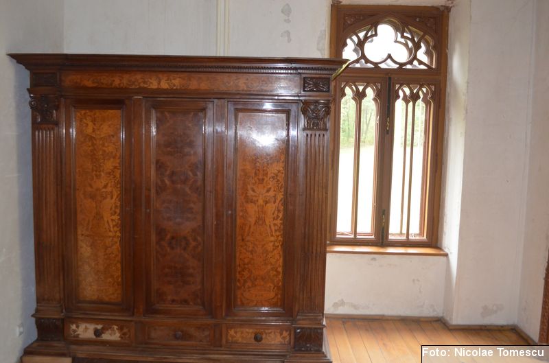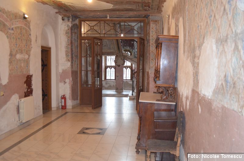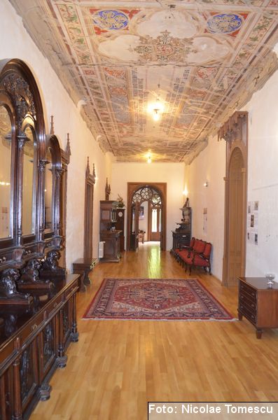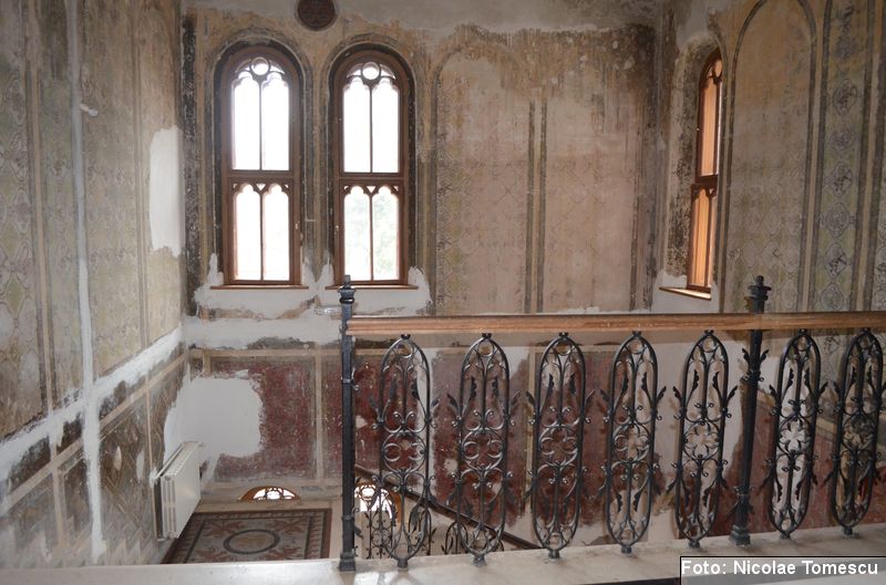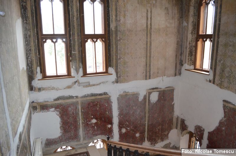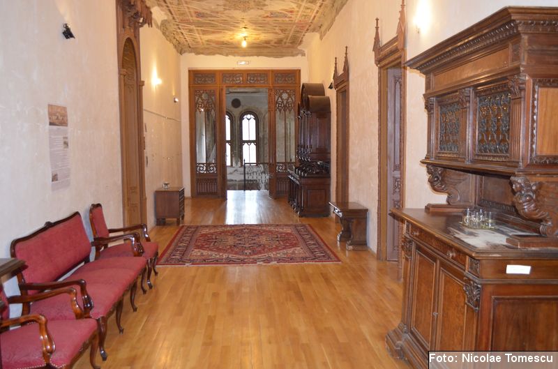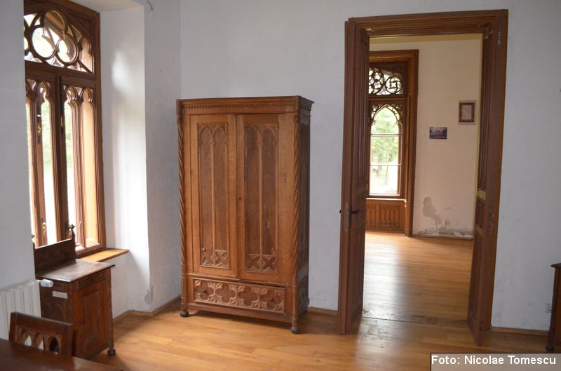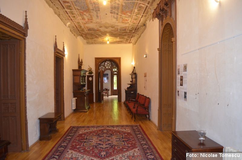 [20] În interior, castelul avea scări centrale din marmură de Dalmația, mobilier din lemn de trandafir, minuțios sculptat, sobe din teracotă, porțelan sau faianță, aduse de peste hotare, parchet cu intarsii din esențe de paltin, mahon, stejar și abanos, confecționat de meșteri austrieci și având motive geometrice și florale. Plafoanele și pereții interiori au fost pictați în ulei, pe ele aflându-se înscrise numeroase dictoane în limba latină… Părțile componente din lemn ale clădirii (uși, ferestre, lambriuri, scări interioare) au fost, cândva, realizate din lemn de stejar, tei și rășinoase, bogat sculptate, profilate, traforate și lustruite cu șelac la nivel de mobilier stil…