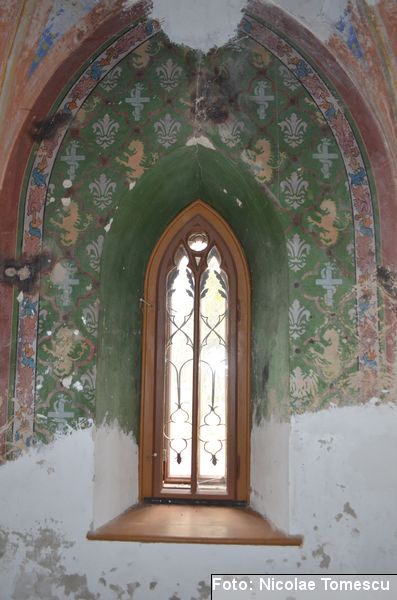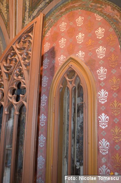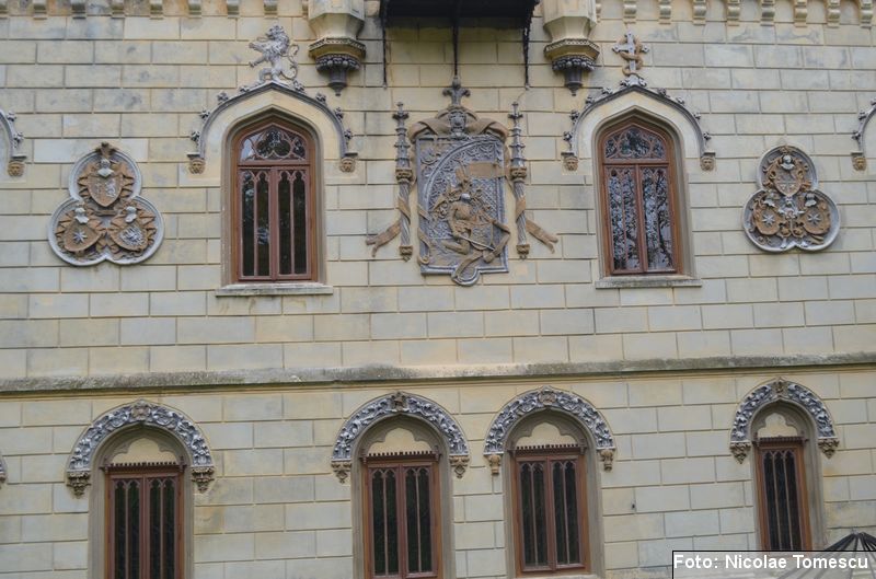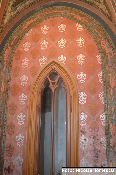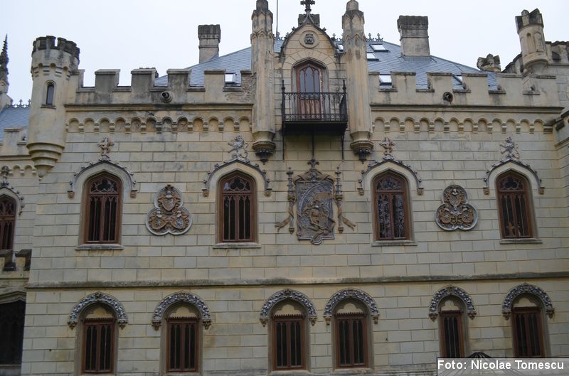 [19] Printre care și steme inspirate din blazonul familiei Sturdza: un leu cu o sabie și o ramură de măslin sau elemente simbolice, realizate, în anul 1898, în stilul Art Nouveau, de către arhitectul Iulius Reinecke. Acesta fusese ajutat de Maria Sturdza, care a ilustrat, în calitate de pictoriță, multe dintre poeziile lui Vasile Alecsandri, vecin și prieten apropiat al familiei Sturdza. Influențele neogotice se regăsesc în: turnulețe gotice, armuri medievale, sală de manej, dictoane latinești înscrise pe pereți, turn de intrare cu pod peste șanțul de apă.