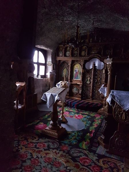 [10] Altarul (cu o grotă minusculă), corul şi nartexul. Altarul se desparte de cor printr-o catapeteasmă (iconostas, peretele despărţitor între altar şi restul bisericii) de lemn, iar corul de nartex prîntr-o icoană mare în postament (aşezată în mijlocul bisericii) şi rame. Din bolta de stâncă se vede că, pe vremuri, s-ar fi prelins picături de apă, adunate într-un vas dinaintea icoanei…
