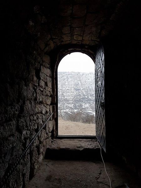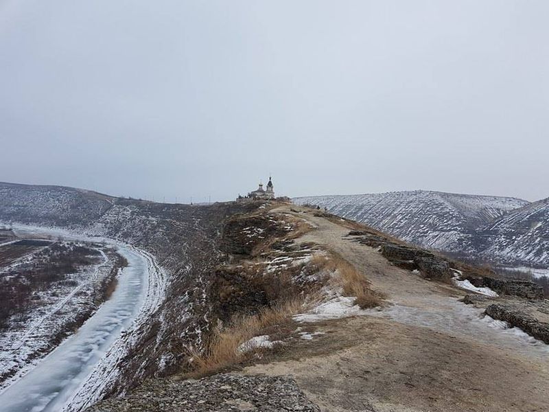În vechime, pentru a pătrunde în locul destinat celebrării cultului creștin, trebuia să treci râul şi să urci pe trepte de piatră[6], până către mijlocul malului stâncos; intrarea dinspre dreapta veghea o galerie (aproape) rotundă[7], săpată în stâncă și formată dintr-o sală în jurul căreia erau adăpostite 11 grote[8], despărţite printr-un zid natural; din galerie[9] se cuvin urcate câteva trepte, pe un coridor îngust spre stânga, şi te întâlnești cu biserica săpată, la rându-i, în piatră; ușa care duce pe o terasă şi către trei ferestre, deschide priveliștea, cu orizont larg, văzută de departe și de la înălțime, asupra Răutului (care şerpuieşte jos), asupra fostei cetăţi…