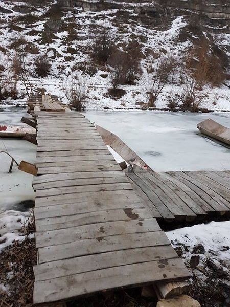 În apropierea bisericii[16] se găseşte rândul de grote (cu succesiune observabilă), dovadă vie a existenței unei mănăstiri, aflată în legătură cu cetatea; o parte este astupată de blocuri de piatră căzute de pe „înălțime”, o parte dezvăluie paturi de piatră în mici caverne (asemănătoare celor întâlnite la biserica din Butuceni)[17]…
