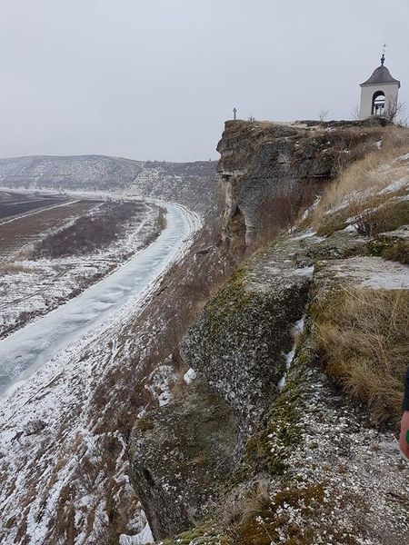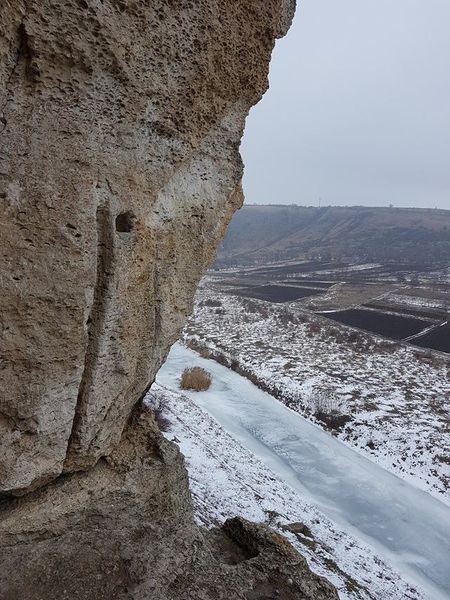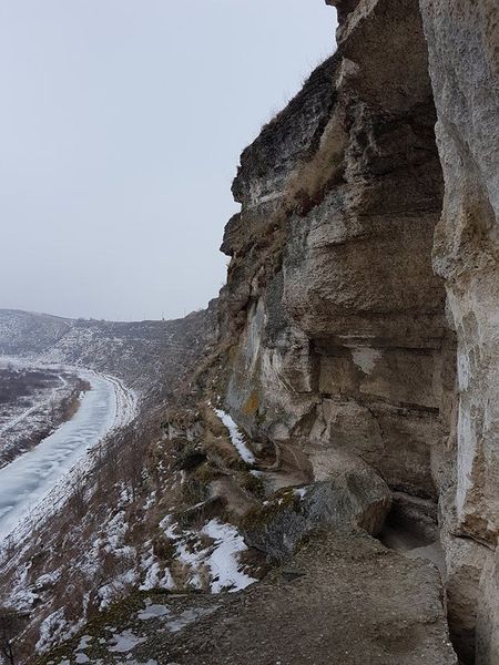 În vechime, pentru a pătrunde în locul destinat celebrării cultului creștin, trebuia să treci râul şi să urci pe trepte de piatră[6], până către mijlocul malului stâncos; intrarea dinspre dreapta veghea o galerie (aproape) rotundă[7], săpată în stâncă și formată dintr-o sală în jurul căreia erau adăpostite 11 grote[8], despărţite printr-un zid natural; din galerie[9] se cuvin urcate câteva trepte, pe un coridor îngust spre stânga, şi te întâlnești cu biserica săpată, la rându-i, în piatră; ușa care duce pe o terasă şi către trei ferestre, deschide priveliștea, cu orizont larg, văzută de departe și de la înălțime, asupra Răutului (care şerpuieşte jos), asupra fostei cetăţi…