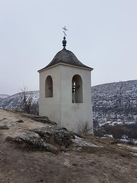 În apropierea bisericii[16] se găseşte rândul de grote (cu succesiune observabilă), dovadă vie a existenței unei mănăstiri, aflată în legătură cu cetatea; o parte este astupată de blocuri de piatră căzute de pe „înălțime”, o parte dezvăluie paturi de piatră în mici caverne (asemănătoare celor întâlnite la biserica din Butuceni)[17]…