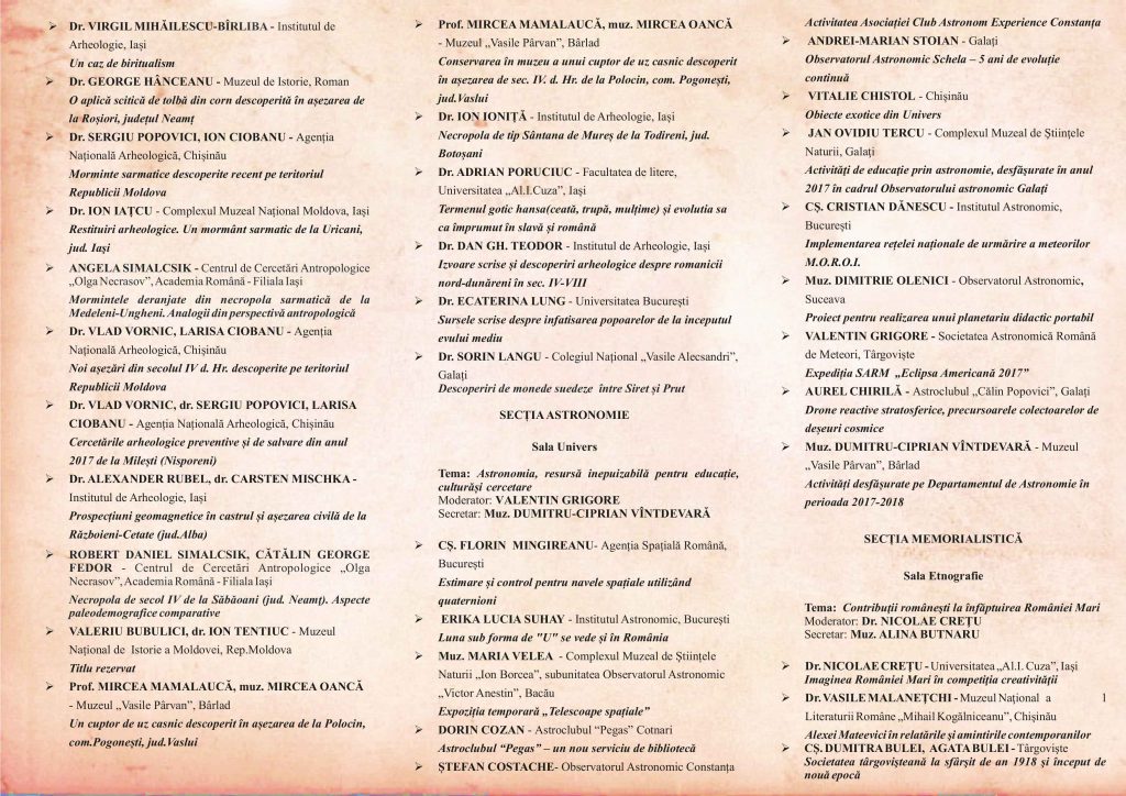 Astfel, la „Secția de arheologie-istorie” organizatorii propun două teme: pentru secțiunea preistorie, tema Noi contribuții în cercetarea preistoriei; pentru perioada primului mileniu creștin, tema Arheologia mileniului I d.Cr. la est și vest de Prut.