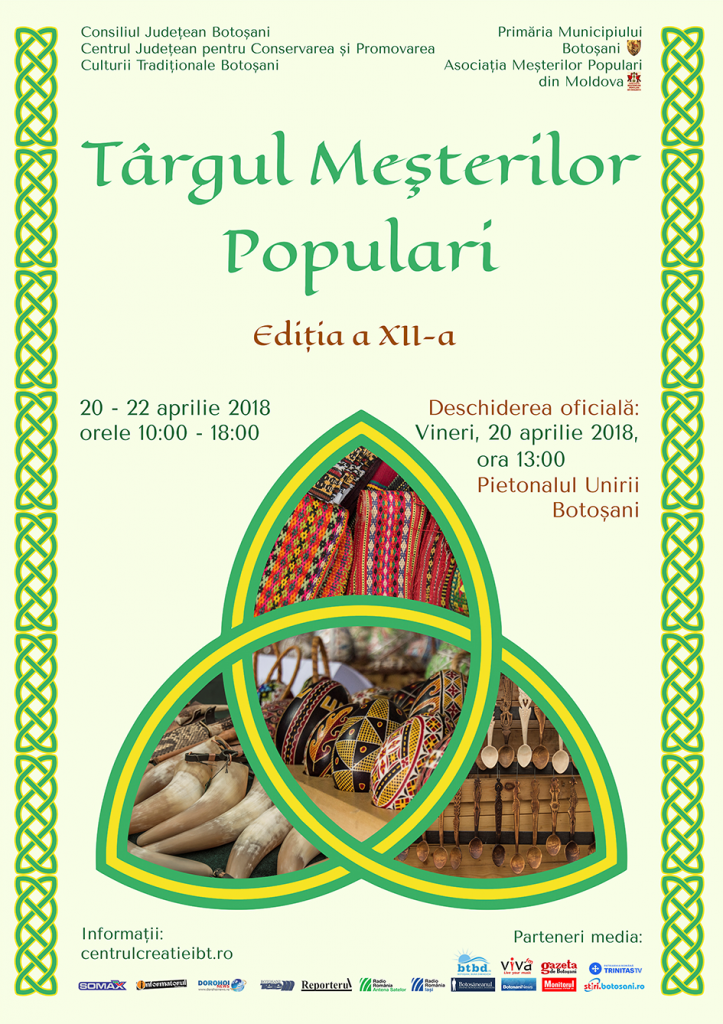 Centrul Judeţean pentru Conservarea și Promovarea Culturii Tradiţionale Botoşani, în colaborare cu Asociaţia Meşterilor Populari din Moldova şi cu Primăria Municipiului Botoşani, organizează Târgul Meşterilor Populari, Ediţia a XII-a, în perioada 20-22 aprilie 2018.