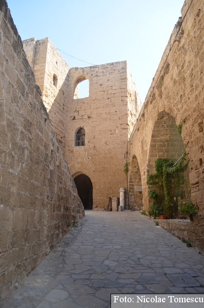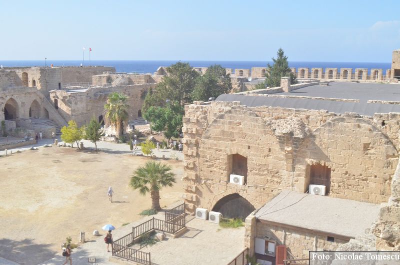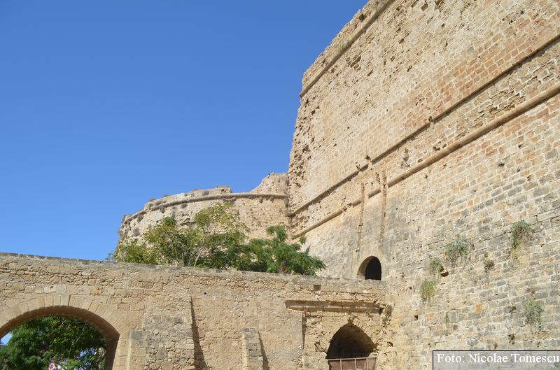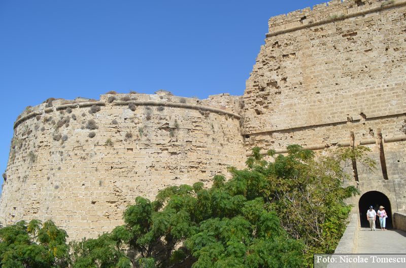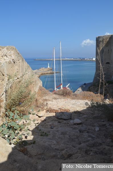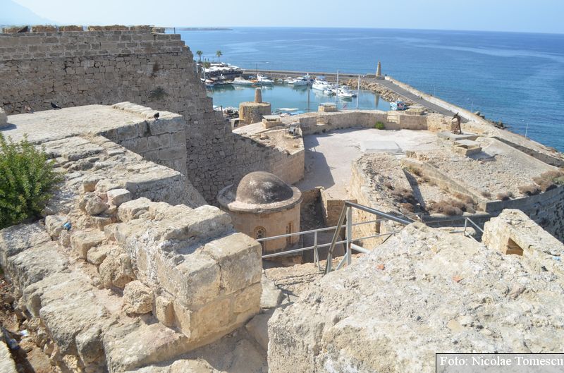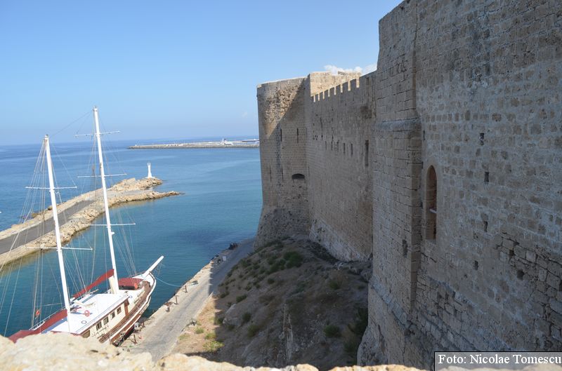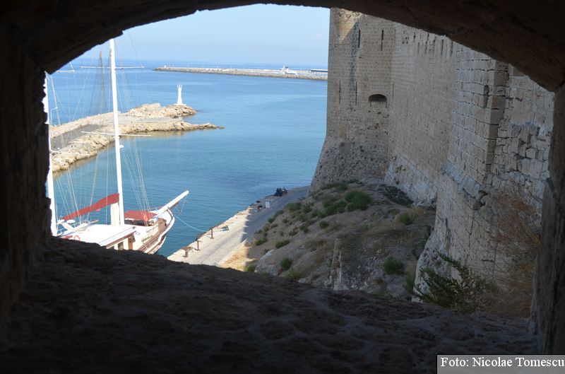 Castelul Kyrenia, spre exemplu, se află în vecinătatea vechiului port[4]. Urcăm trepte sau pante, coborîm, trecem prin culoare boltite pline de fascicule luminoase, intrăm în încăperi cu mirosul înghețat al întunericului, ne jucăm pașii pe ziduri pentru a cuprinde portul, digul si întinderea nesfârșită a mării, pătrundem în cele trei perioade importante ale existenței fortului: bizantină (330-1192), cruciată (1192-1472) și venețiană (1472-1570). Uneori, nevoia de exactitate poate fi o dovadă de mărginire a spiritului. Nu cunoaștem anul construcției, se presupune doar că a fost ridicat de bizantini în scopuri defensive. Prima atestare istorică a castelului datează din anul 1191, englezul Richard Inimă de Leu și a treia cruciadă fiind simbolurile care înlesnesc înțelegerea. În posesia Cavalerilor Templieri, apoi a lui Guy de Lusignan[5], micul castel cu rol militar a fost extins; i s-au adăugat turnuri pătrate și în formă de potcoavă, o nouă intrare, locuri de tragere pentru arcași[6], deopotrivă temnițe. Cu ocazia acestor extinderi, zidurile au îmbrățișat Biserica Sfântul Gheorghe, construită de bizantini în secolele XI-XII. Iar cu respectivele fortificații, deși asediat de mai multe ori, castelul se mândrea că este imposibil de cucerit; dar colosul de piatră, cu ziduri masive, cu șanț de apărare[7], cu atâtea puncte de observație și tragere s-a predat turcilor (în 1570). Camerele regale, încăperile gărzilor și închisoarea din perioada Lusignană se găsesc la nord și est; în sud s-au înstăpânit fortificațiile din perioada bizantină. Putem urca treptele până la apartamentele regale și capelă. Subsolul este plin de urmele temnițe, depozitelor și pulberăriilor, iar, în curtea interioară, una dintre clădiri adăpostește Muzeul naufragiului[8].