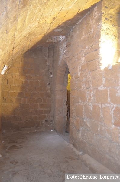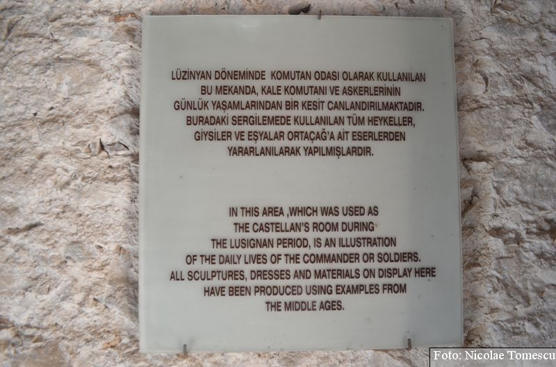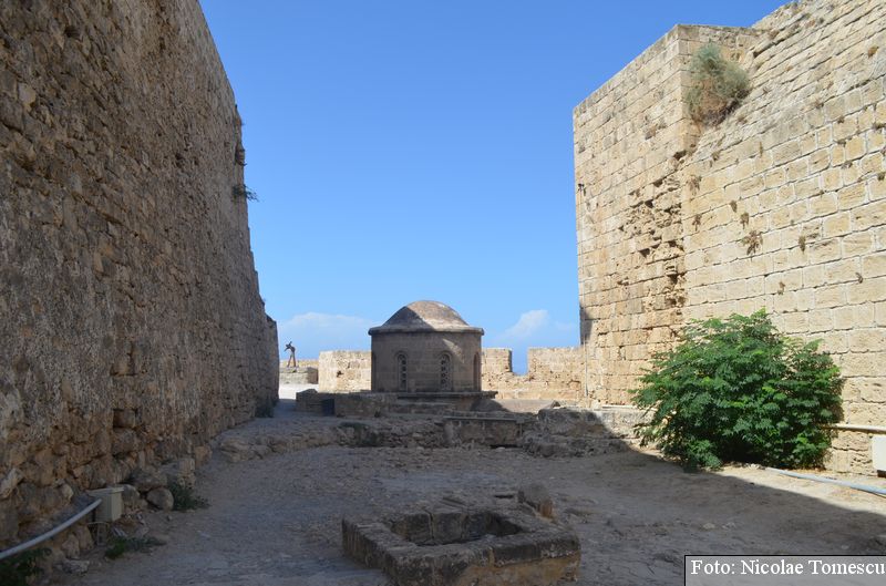 [5] Dincolo de intrarea principală, un culoar boltit duce la intrarea în castelul Lusignan. În coridorul de intrare al castelului Lusignan, veghează mormântul amiralului otoman Sadik Pașa; coridorul conduce spre curtea interioară, unde pot fi identificate foste spații de locuit și grajduri…