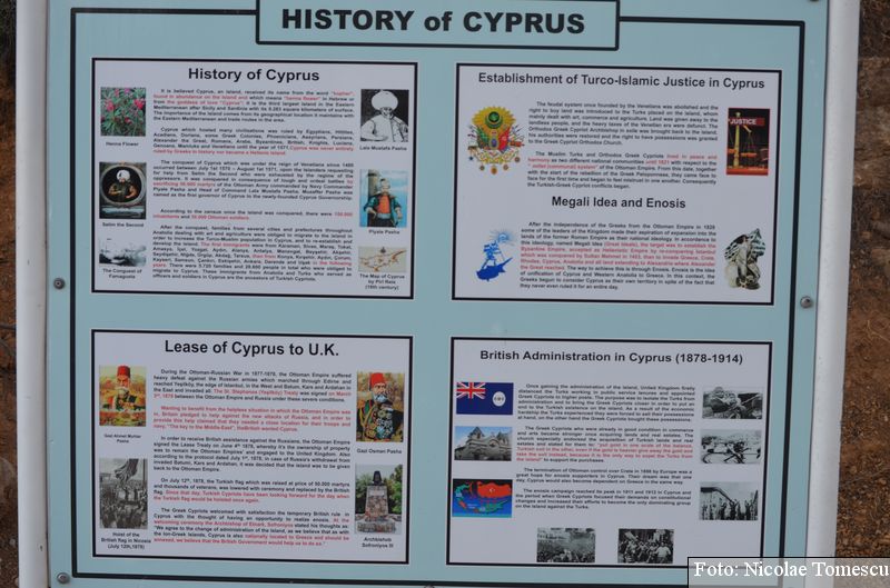 [2] Fostă colonie britanică (a devenit republică independentă în 1960, membră a Commonwealth-ului în 1961), Cipru încă mai găzduiește baze militare, chiar sate întregi în care locuiesc numai membri ai armatei Albionului. Cine intră în aceste zone se supune legilor Marii Britanii; astfel, până și un delict în trafic este penalizat ca în Londra. Limbile oficiale sunt greaca și turca, însă engleza pare vorbită fluent de aproape toți locuitorii părții sudice, nu neapărat și de toți ciprioții turci.